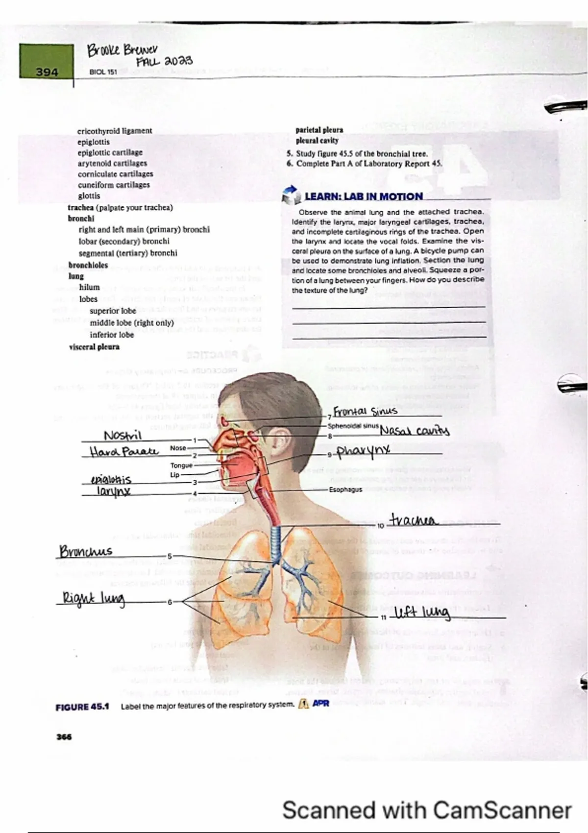 Study guide for respiratory anatomy: labeling larynx, trachea, bronchi, lungs, pleura, and bronchial tree. Includes nasal cavity, pharynx, vocal cords, and histological lung texture.