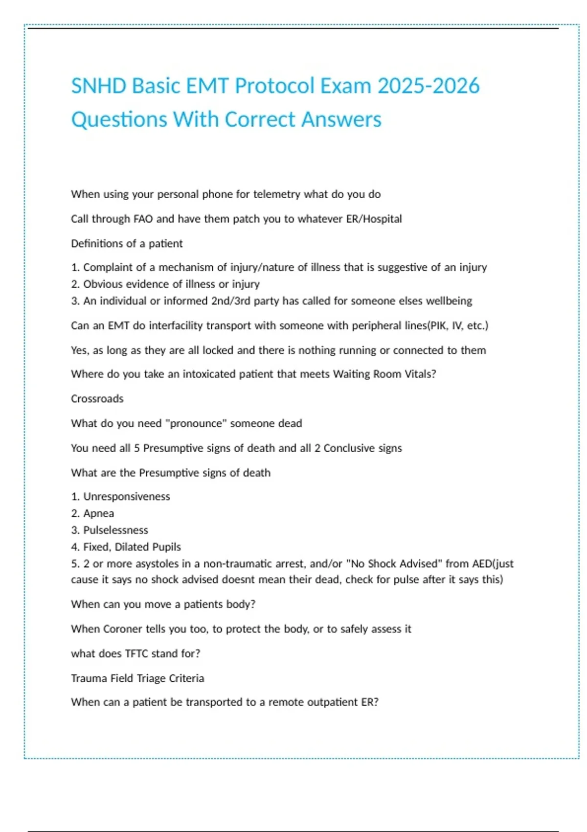 SNHD Basic EMT Protocol Exam Questions With Correct Answers
