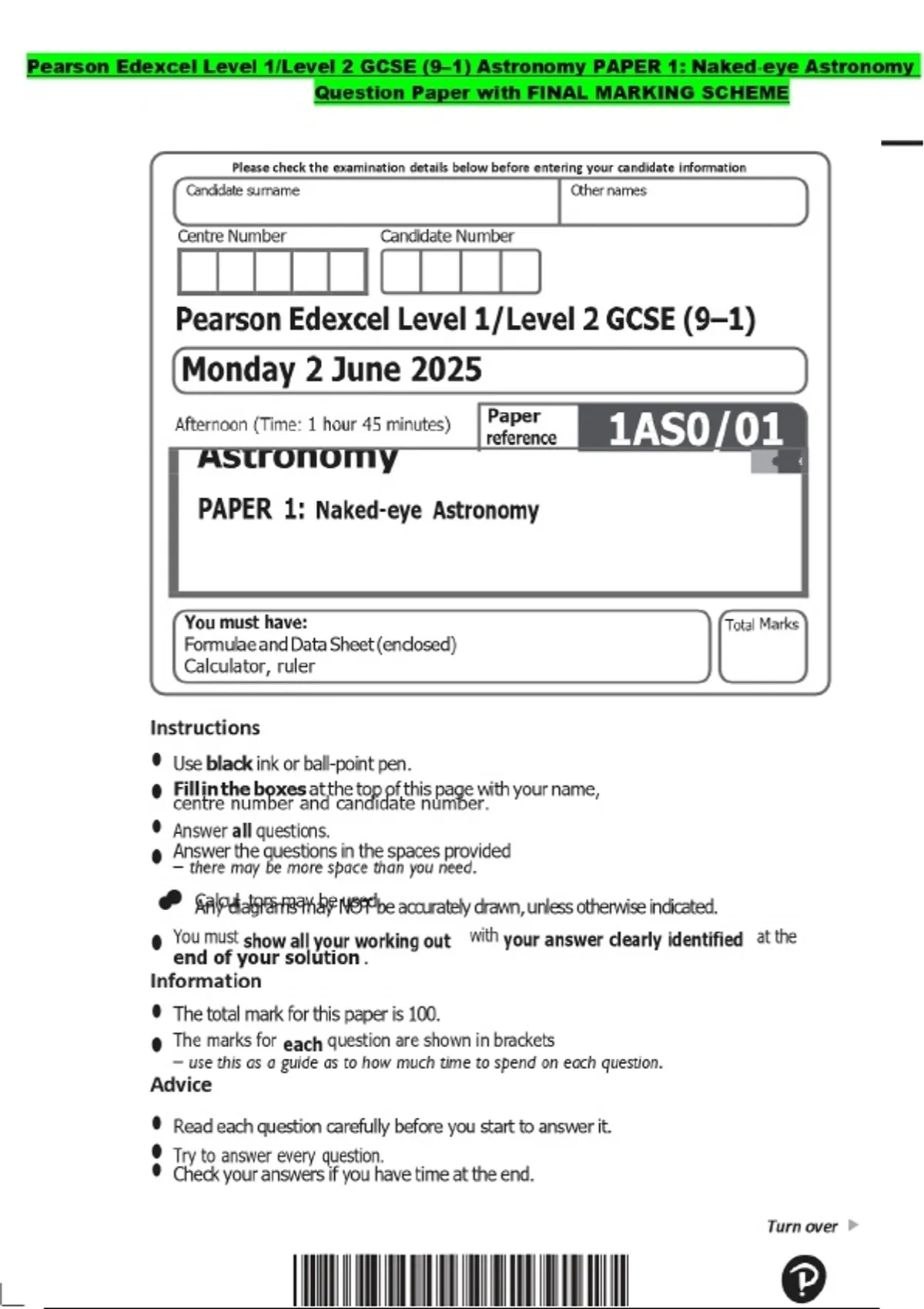 Pearson Edexcel Level 1/Level 2 GCSE (9–1) Astronomy PAPER 1: Naked‑eye Astronomy Question Paper with FINAL MARKING SCHEME