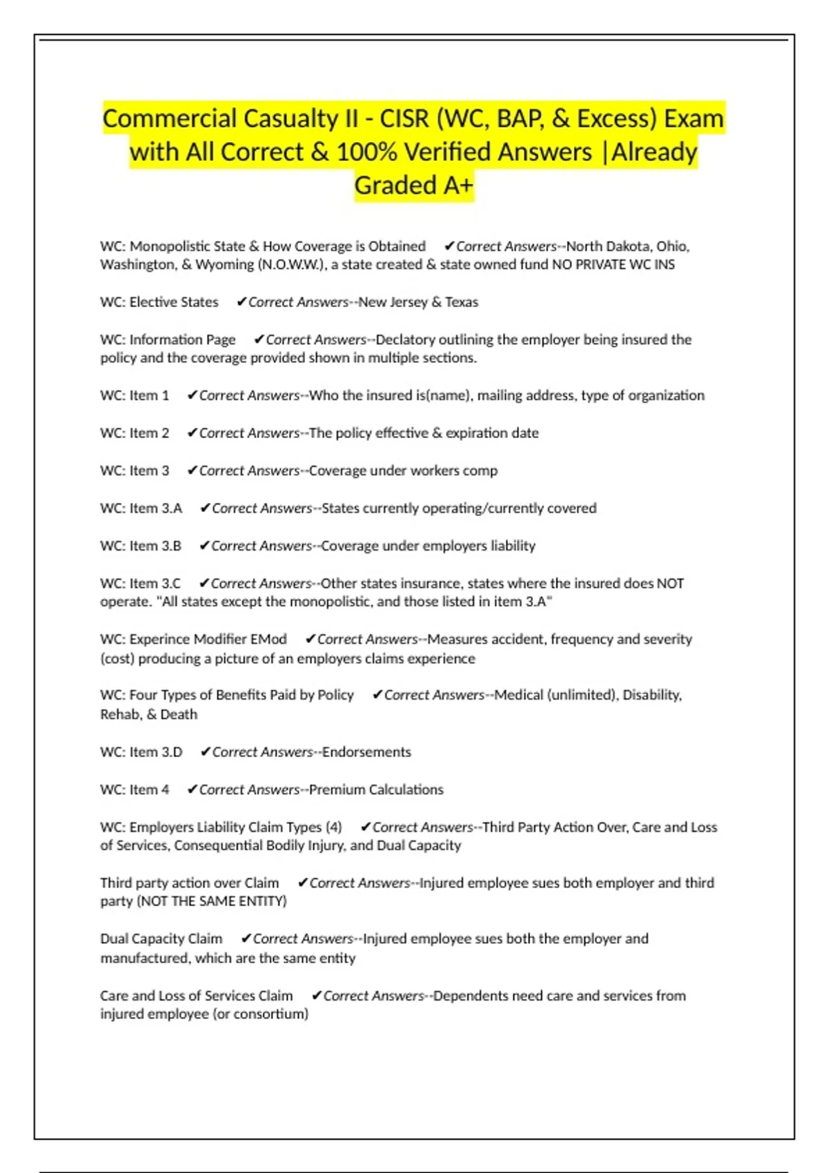 Commercial Casualty II - CISR (WC, BAP, & Excess) Exam with All Correct & 100% Verified Answers |Already Graded A+