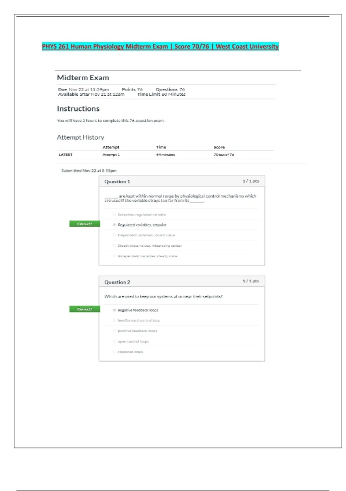PHYS 261 Human Physiology Midterm Exam | Score 70/76 | West Coast University