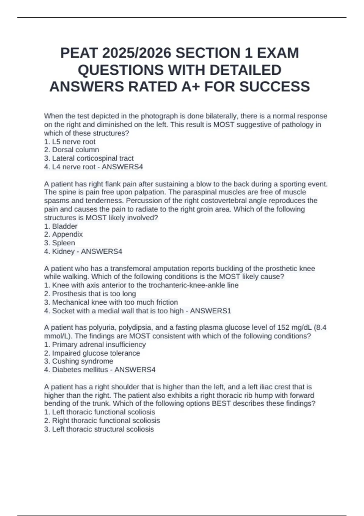 When the test depicted in the photograph is done bilaterally, there is a normal response on the right and diminished on the left. This result is MOST suggestive of pathology in which of these structures? 1. L5 nerve root 2. Dorsal column 3. Lateral corticospinal tract 4. L4 nerve root - ANSWERS4 A patient has right flank pain after sustaining a blow to the back during a sporting event. The spine is pain free upon palpation. The paraspinal muscles are free of muscle spasms and tenderness. Percussion of the right costovertebral angle reproduces the pain and causes the pain to radiate to the right groin area. Which of the following structures is MOST likely involved? 1. Bladder 2. Appendix 3. Spleen 4. Kidney - ANSWERS4 A patient who has a transfemoral amputation reports buckling of the prosthetic knee while walking. Which of the following conditions is the MOST likely cause? 1. Knee with axis anterior to the trochanteric-knee-ankle line 2. Prosthesis that is too long 3. Mechanical knee with too much friction 4. Socket with a medial wall that is too high - ANSWERS1 A patient has polyuria, polydipsia, and a fasting plasma glucose level of 152 mg/dL (8.4 mmol/L). The findings are MOST consistent with which of the following conditions? 1. Primary adrenal insufficiency 2. Impaired glucose tolerance 3. Cushing syndrome 4. Diabetes mellitus - ANSWERS4