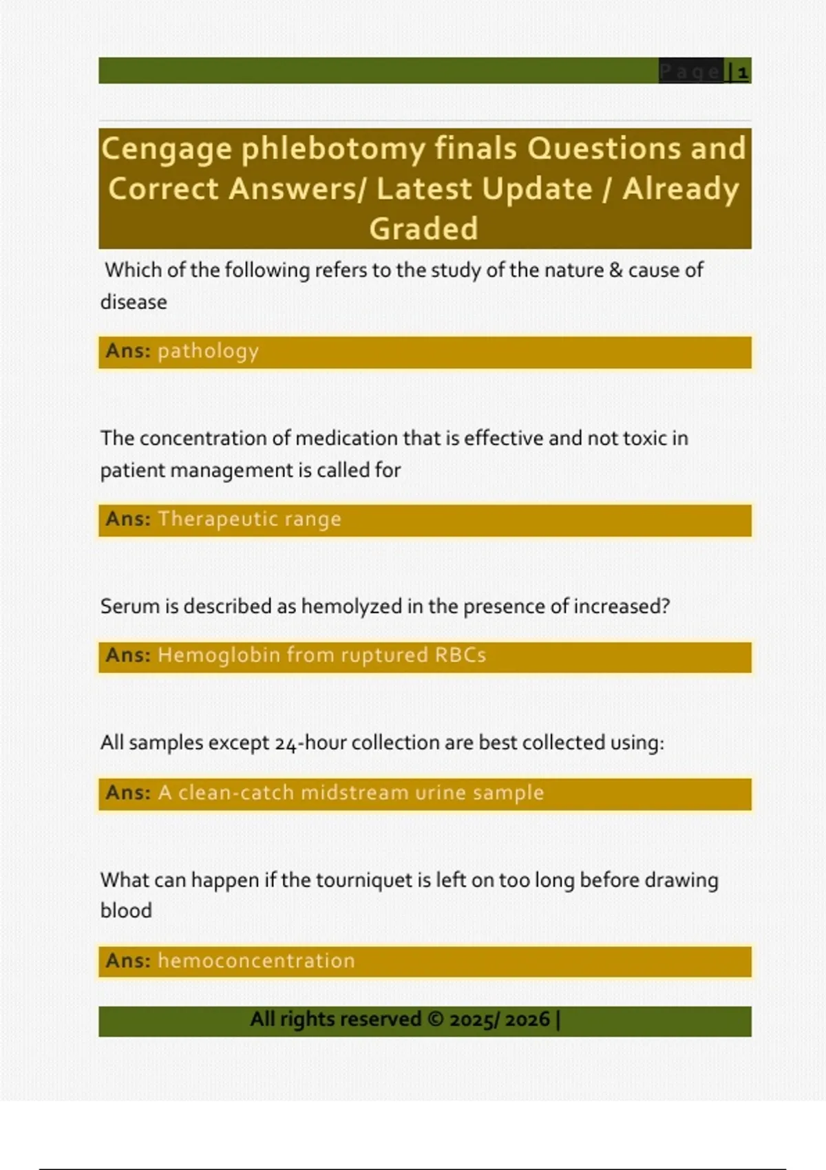 Which of the following refers to the study of the nature & cause of disease Ans: pathology The concentration of medication that is effective and not toxic in patient management is called for Ans: Therapeutic range Serum is described as hemolyzed in the presence of increased? Ans: Hemoglobin from ruptured RBCs All samples except 24-hour collection are best collected using: Ans: A clean-catch midstream urine sample What can happen if the tourniquet is left on too long before drawing blood Ans: hemoconcentration All rights reserved © 2025/ 2026 | Page | 2 Serum is described as icteric in the presence of increased Ans: bilirubin, causing jaundice What is the difference between plasma and serum Ans: plasma contains fibrinogen; serum does not An unconscious unidentified man is admitted to an emergency trauma center . What would be the system of choice to ensure patient identification? transfused. Ans: Use a three-part identification system that utilizes a temporary armband and labels for specimens and blood to be an unexpected occurrence involving death or serious physical or psychological injury, or the risk thereof Ans: sentinel event Which of the following needle gauges are the most common Ans: 21 gauge and 22 gauge All rights reserved © 2025/ 2026 | Page | 3 if urine specimen testing is delayed by more than one hour , all of the following special precautions must be taken except Ans: Refrigeration at 10 Celsius What can happen if you squeeze the patient's finger too vigorously during a capillary puncture Ans: D.BOTH A & B Which is generally the most common complication from phlebotomy Ans: hematoma