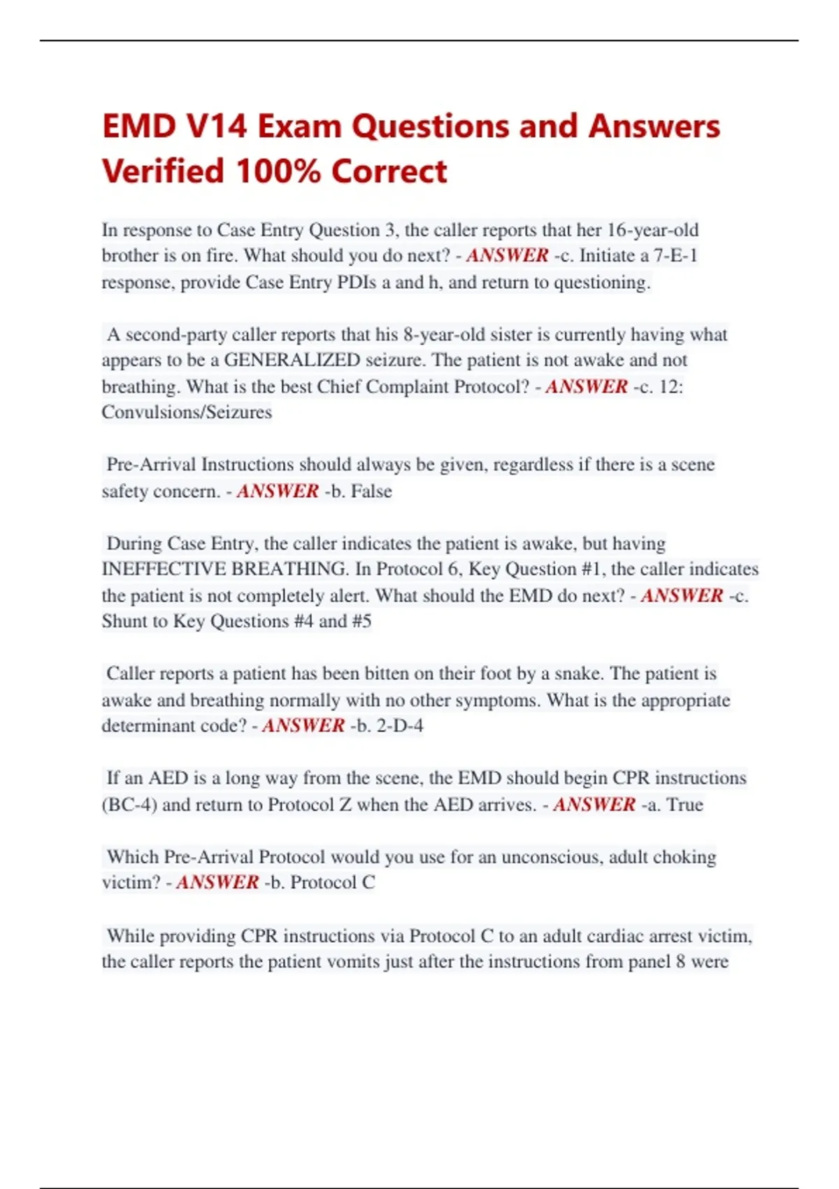 EMD V14 Exam Questions and Answers Verified 100% Correct In response to Case Entry Question 3, the caller reports that her 16-year-old brother is on fire. What should you do next? - ANSWER -c. Initiate a 7-E-1 response, provide Case Entry PDIs a and h, and return to questioning. A second-party caller reports that his 8-year-old sister is currently having what appears to be a GENERALIZED seizure. The patient is not awake and not breathing. What is the best Chief Complaint Protocol? - ANSWER -c. 12: Convulsions/Seizures Pre-Arrival Instructions should always be given, regardless if there is a scene safety concern. - ANSWER -b. False During Case Entry, the caller indicates the patient is awake, but having INEFFECTIVE BREATHING. In Protocol 6, Key Question #1, the caller indicates the patient is not completely alert. What should the EMD do next? - ANSWER -c. Shunt to Key Questions #4 and #5 Caller reports a patient has been bitten on their foot by a snake. The patient is awake and breathing normally with no other symptoms. What is the appropriate determinant code? - ANSWER -b. 2-D-4 If an AED is a long way from the scene, the EMD should begin CPR instructions (BC-4) and return to Protocol Z when the AED arrives. - ANSWER -a. True Which Pre-Arrival Protocol would you use for an unconscious, adult choking victim? - ANSWER -b. Protocol C While providing CPR instructions via Protocol C to an adult cardiac arrest victim, the caller reports the patient vomits just after the instructions from panel 8 were successfully given. What should the EMD do next? - ANSWER -b. Read the instructions from panel 15, then return to sequence Post-Dispatch Instructions will be read as scripted but may be enhanced with a situational or conditional statement as long as the meaning or intent of the instruction is kept intact. - ANSWER -a. True A question with the pre-question qualifier of female 12- 50 should be asked - ANSWER -only when the caller reports that the patient is a female between the ages of 12 and 50 Key questions must be asked in in order as written - ANSWER -True When the callers description indicates that the patient is having heart attack like symptoms, choose which protocol - ANSWER -10 chest pain/ chest discomfort During Case Entry, the caller indicates a 38-year-old male patient is experiencing abdominal pain for the past 2 hours. The patient is awake and breathing and seated next to the caller. Which Key Questions would you ask next? - ANSWER -Key questions 1&4 In Protocol 5, in ANSWER to Key Question 2, the caller indicates an hour ago he was playing football with his friends and tweaked his back when tackling someone. What should the EMD do next? - ANSWER -Shunt to protocol 30 Code for a patient that has been experiencing nausea for the past 3 days? The patient is completely alert, breathing normally and has no other symptoms. - ANSWER -26-A-6 A chest pain patient with pale skin is considered to be CHANGING COLOR. - ANSWER -False During Case Entry, the caller reports their loved one is experiencing heart palpitations. The caller reports they were simply watching TV when this started. The patient is currently awake and breathing. What is the appropriate Protocol to go to after Case Entry? - ANSWER -Protocol 19 During questioning in Protocol 18, the caller ANSWERs Key Question #4 as "Yes,". what should the EMD do next? - ANSWER -Ask Key Questions 5, 6 and 7, then complete the Stroke Diagnostic Tool When the complaint description strongly suggests GENERALIZED seizure, go to Protocol 12 regardless of consciousness and breathing status. - ANSWER -True Case Entry Protocol - ANSWER -0 Accelerator Stuck and Can't Stop Vehicle - ANSWER -Stop Sign Abdominal Pain/ Problems - ANSWER -1 Allergies (reactions) / Envenomation (Stings & Bites) - ANSWER -2 Epinephrine Auto Injector - ANSWER -P Animal Bites/ Attacks - ANSWER -3 Assault/ Sexual Assault/ Stun Gun - ANSWER -4 Back Pain (Non-Traumatic or Non-Recent Trauma) - ANSWER -5 Breathing Problems - ANSWER -6 Burns (scalds)/ Explosion (blast) - ANSWER -7 Carbon Monoxide/ Inhalation/ HAZMAT/ CBRN - ANSWER -8 Cardiac or Respiratory Arrest/ Death - ANSWER -9 Chest Pain/ Chest Discomfort (Non- Traumatic) - ANSWER -10