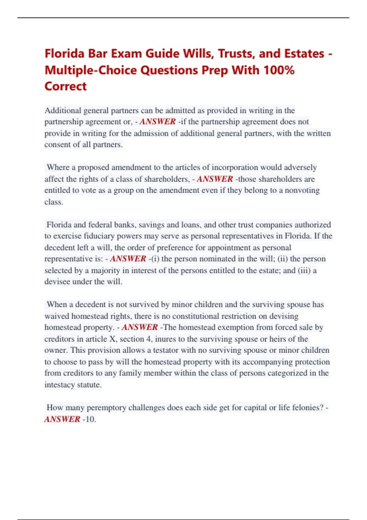 Florida Bar Exam Guide Wills, Trusts, and Estates - Multiple-Choice Questions Prep With 100% Correct Additional general partners can be admitted as provided in writing in the partnership agreement or, - ANSWER -if the partnership agreement does not provide in writing for the admission of additional general partners, with the written consent of all partners. Where a proposed amendment to the articles of incorporation would adversely affect the rights of a class of shareholders, - ANSWER -those shareholders are entitled to vote as a group on the amendment even if they belong to a nonvoting class. Florida and federal banks, savings and loans, and other trust companies authorized to exercise fiduciary powers may serve as personal representatives in Florida. If the decedent left a will, the order of preference for appointment as personal representative is: - ANSWER -(i) the person nominated in the will; (ii) the person selected by a majority in interest of the persons entitled to the estate; and (iii) a devisee under the will. When a decedent is not survived by minor children and the surviving spouse has waived homestead rights, there is no constitutional restriction on devising homestead property. - ANSWER -The homestead exemption from forced sale by creditors in article X, section 4, inures to the surviving spouse or heirs of the owner. This provision allows a testator with no surviving spouse or minor children to choose to pass by will the homestead property with its accompanying protection from creditors to any family member within the class of persons categorized in the intestacy statute. How many peremptory challenges does each side get for capital or life felonies? - ANSWER -10. A will may be revoked by canceling, defacing, or obliterating it with the intent, and for the purpose, of revocation. - ANSWER -The intention to revoke must be present at the time of the physical act for revocation to be effective. In Florida, the attorney owes a duty, not only to the client who contracted for his services, but also to the beneficiaries named in the will. - ANSWER -Thus, the beneficiaries can sue the attorney for negligence in the preparation of the will. Generally, all persons held in custody are entitled to pretrial release on reasonable conditions. - ANSWER -However, an accused may be detained pending trial if no condition of release can adequately protect the community from the risk of harm to any person. The Florida statute provides a broad grant of authority to the personal representative to perform many transactions without court order. In the vast majority of cases, if a fee simple owner may do it, a personal representative may do it without a court order. - ANSWER -However, there are some exceptions. If the will does not grant a power of sale, any sale of real property must be authorized or confirmed by the court. The power of a personal representative to continue the decedent's unincorporated business without court order is limited to a period of four months from the date of his appointment; after that period, the personal representative must get approval of the circuit court. Under Florida law, a corporation incorporated in another state, but doing business in Florida must: - ANSWER -obtain a certificate of authority to transact business within the state and must file an annual report with the Department of State. In addition, a foreign corporation doing business in Florida must maintain a registered office and agent in the state. Upon application of any interested person, the court may reform the terms of a will, even if unambiguous, to conform the terms to the testator's intent if it is proved by clear and convincing evidence that both the accomplishment of the testator's intent and the terms of the will were affected by a mistake of fact or law, whether in expression or inducement. In determining the testator's original intent, the court may consider evidence relevant to the testator's intent even though the evidence contradicts an apparent plain meaning of the will. - ANSWER -A latent ambiguity exists when the language of the will, although clear on its face in describing a beneficiary or property, results in a misdescription when applied to the facts to which it refers. Extrinsic evidence is admissible to cure the latent ambiguity. Extrinsic evidence may be admissible to show that a provision was mistakenly omitted from a will, or that a provision contained in the will is not what the testator intended. If the alleged mistake involves the reasons that led the testator to make the will, relief may be granted if there is clear and convincing evidence that the accomplishment of the testator's intent and the terms of the will were affected. An incoming partner is liable for all obligations of the partnership including those incurred before becoming a member of the partnership. - ANSWER -However, that liability is not personal unless the incoming partner subjects himself to personal liability by novation or by a promise to pay the existing debt. A disclaimer in interest to an estate must be in writing, signed, witnessed, and acknowledged in the manner provided for the conveyance of real property. Then the disclaimer is filed with the clerk of court. - ANSWER -A disclaimer filed under the statute is irrevocable, and is effective on the date it is filed. In Florida, the right to disclaim will be barred if the beneficiary is insolvent at the time of the event giving rise to the right to disclaim. A copy of the disclaimer instrument must be delivered to the personal representative, trustee, or other person having title to or possession of the disclaimed interest. A disclaimed interest passes as though the disclaiming party predeceased the decedent. - ANSWER -Thus, it passes to children, per stirpes. Circuit courts have jurisdiction over disputes seeking more than $15,000, excluding interest and costs. - ANSWER -In a class action, the claims of the class members may be aggregated to meet 