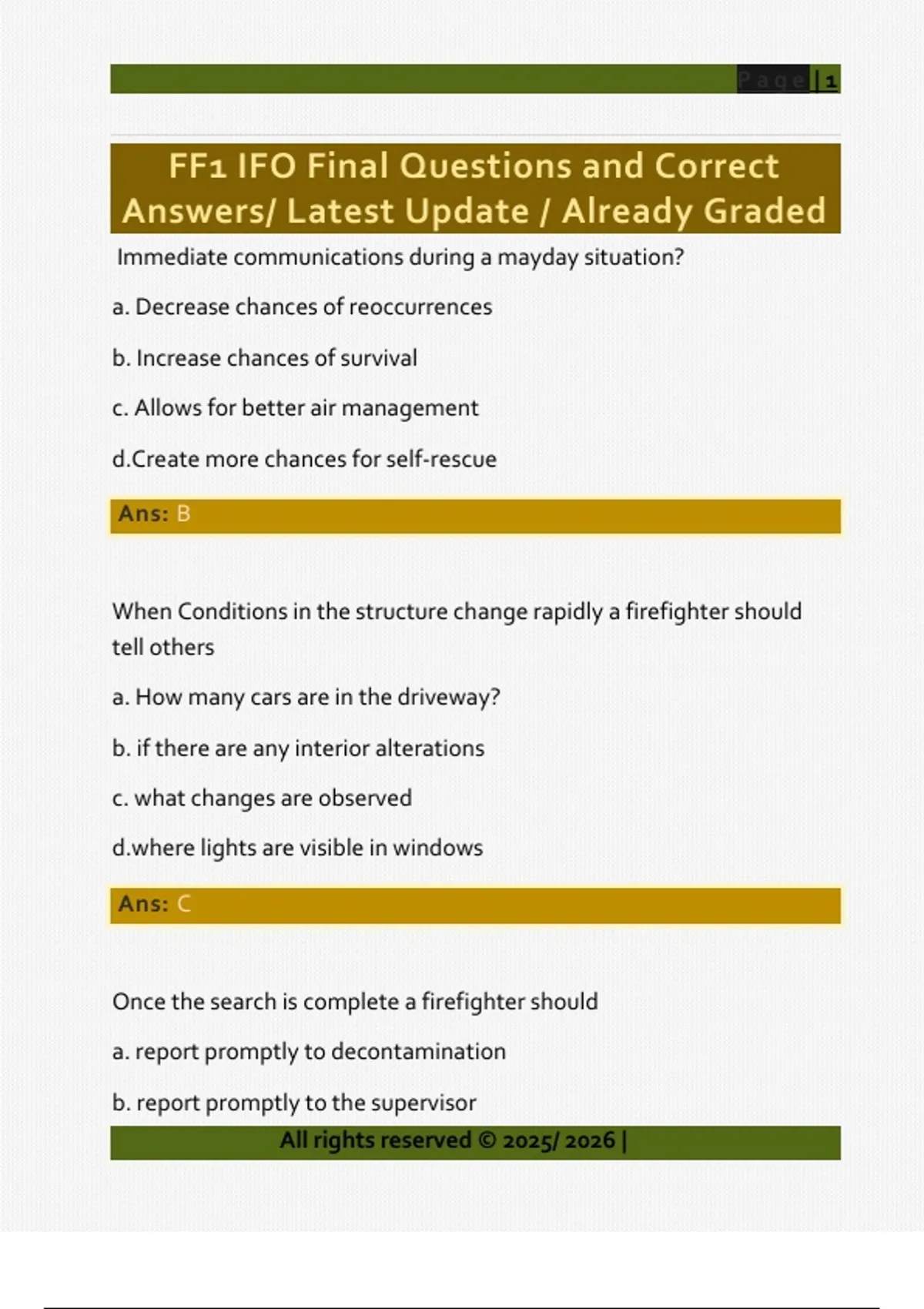 Immediate communications during a mayday situation? a. Decrease chances of reoccurrences b. Increase chances of survival c. Allows for better air management d.Create more chances for self-rescue Ans: B When Conditions in the structure change rapidly a firefighter should tell others a. How many cars are in the driveway? b. if there are any interior alterations c. what changes are observed lights are visible in windows Ans: C Once the search is complete a firefighter should a. report promptly to decontamination b. report promptly to the supervisor All rights reserved © 2025/ 2026 | Page | 2 c. report promptly too RIC/RIT t promptly to recovery Ans: B When crawling on stairs proceed _____ first one ascending and ____first one descending a. Head feet b. feet head c. hands feet d. feet hands Ans: A When is secondary search performed? a. during initial fire suppression b. immediately after the primary search is complete c. approximately 30 minutes after the primary search initial fire suppression is complete Ans: D All rights reserved © 2025/ 2026 | Page | 3 Ans: D When encountering fire in a room during structural search firefighters should: a. wedge the door open and report conditions b. monitor atmosphere and report conditions c. continue search and report conditions when done d. close the door and report conditions Size up is initially performed by: a. the escaped occupants b. the first fi