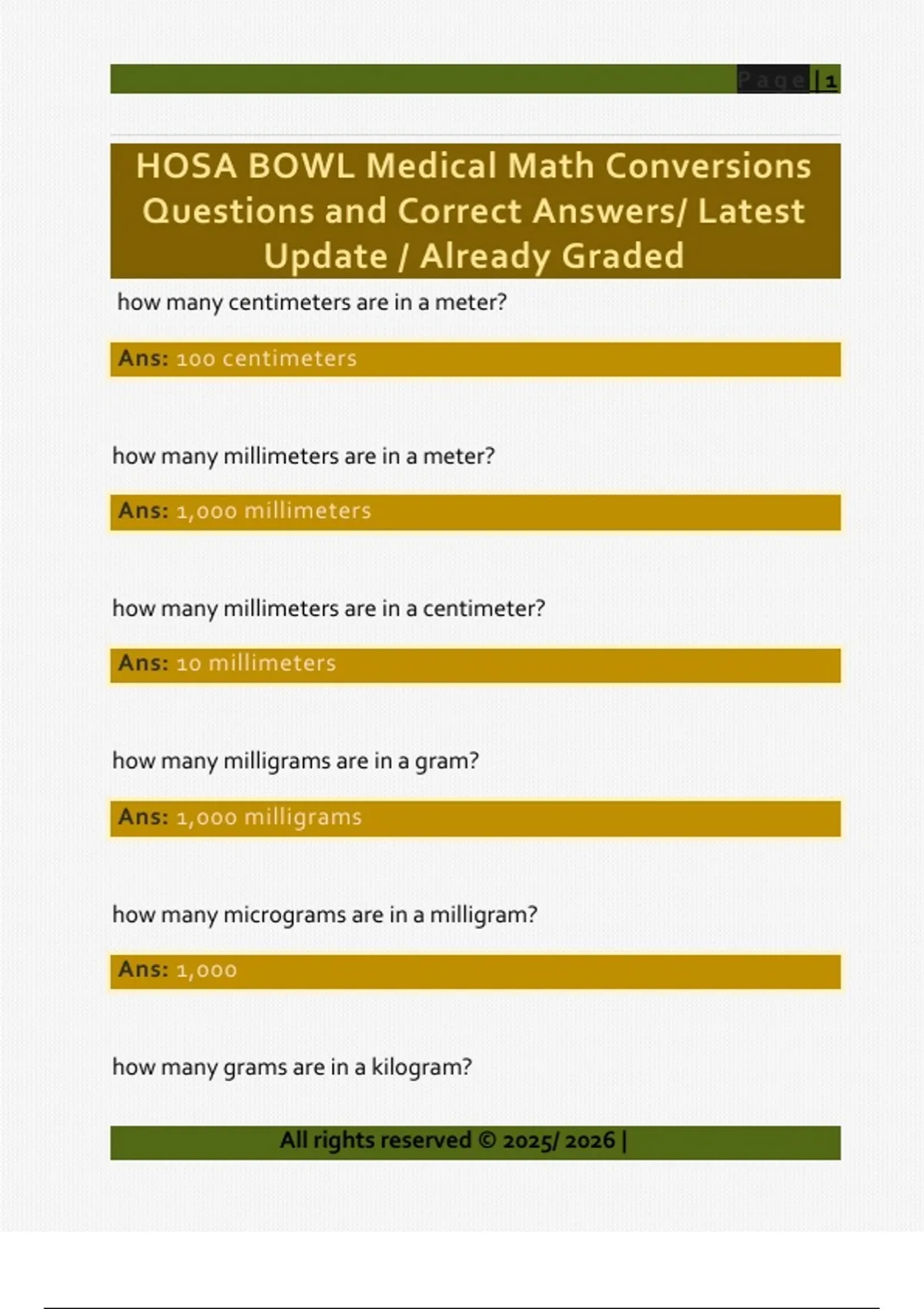 HOSA BOWL Medical Math Conversions Questions and Correct Answers/ Latest Update / Already Graded