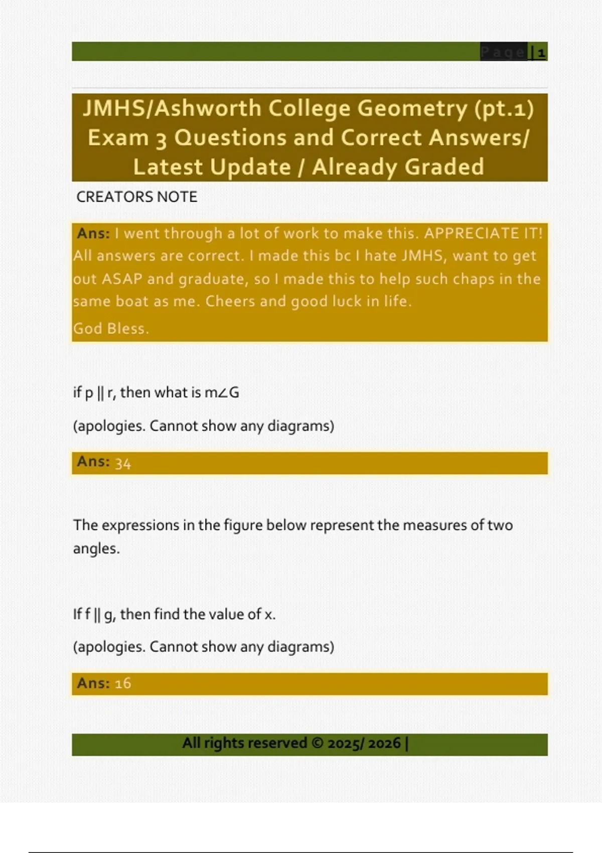 JMHS/Ashworth College Geometry (pt.1) Exam 3 Questions and Correct Answers/ Latest Update / Already Graded