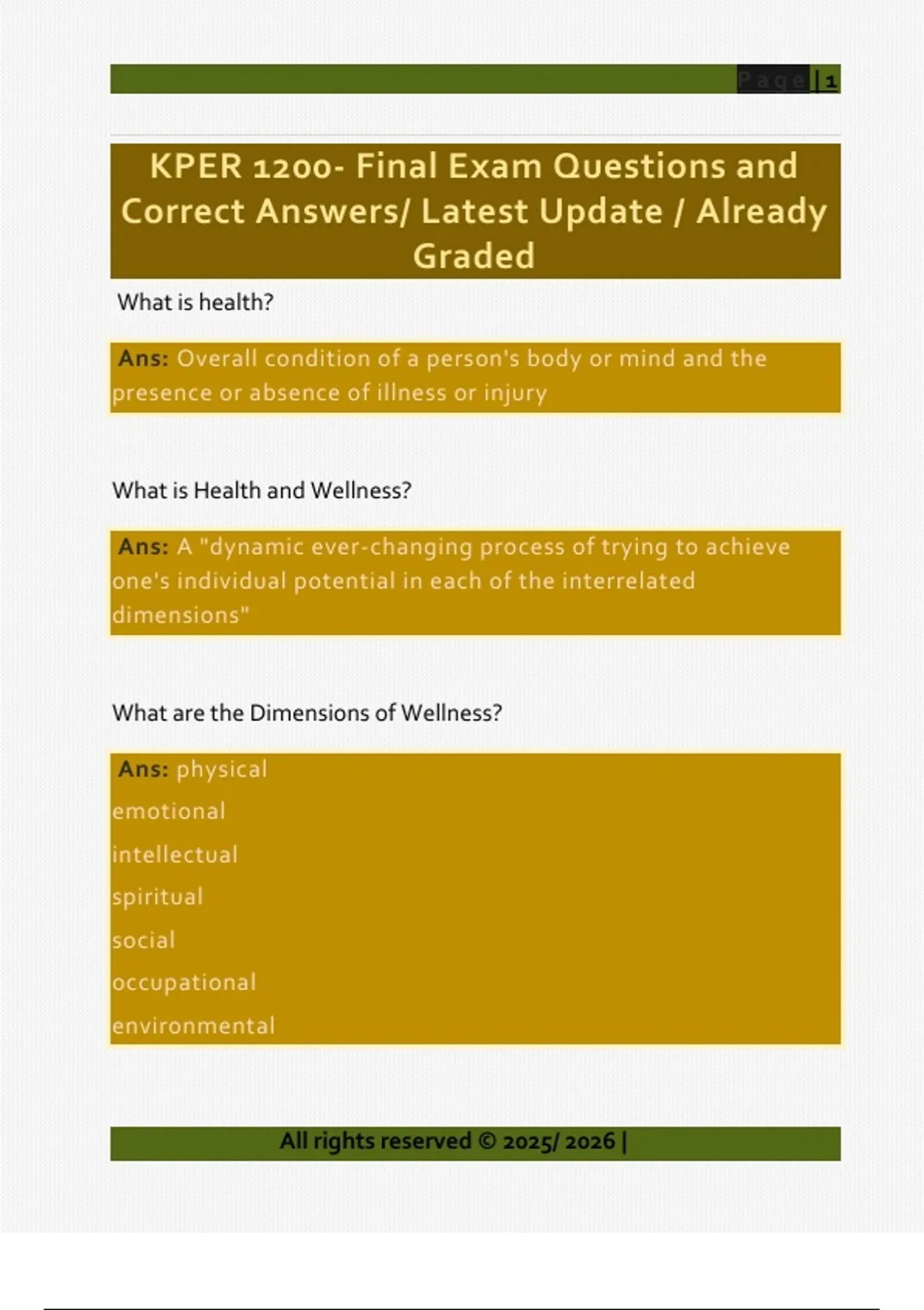 What is health? Ans: Overall condition of a person's body or mind and the presence or absence of illness or injury What is Health and Wellness? Ans: A "dynamic ever-changing process of trying to achieve one's individual potential in each of the interrelated dimensions" What are the Dimensions of Wellness? Ans: physical emotional intellectual spiritual social occupational environmental Page | 2 All rights reserved © 2025/ 2026 | How much exercise should you do each week? Ans: - 150 minutes of moderate-vigorous aerobic activity - bone and muscle strengthening 2 times - several hours of light physical activity How often should you get up and move when you are sedentary? Ans: Every 20-30 minutes Why is too much or too little sleep not recommended? Ans: - Immune system - Reduced risk of cardiovascular disease - Healthy metabolism - Memory, attention, cognitive abilities - Motor performance - Mental health - Hormones- cortisol - Weight control Alcohol Use Ans: - Women = max 2 drinks per day, 10 drinks per week - Men = max 3 drinks per day, 15 drinks per week Page | 3 All rights reserved © 2025/ 2026 | What is a healthy weight? Ans: BMI between 18.5- 24.9 BMI and status Ans: - 18.5 = underweight - 18.5- 24.9 = normal - 25- 29.9 = overweight - 30 = obese What is spiritual health? Ans: The innermost part of us that helps us identify meaning, purpose, and value in our lives What is social health? Ans: The ability to develop and sustain satisfying relationships, interact efficiently with others and being able to adapt to a variety of social situations What is environmental health? Page | 4 All rights reserved © 2025/ 2026 | Ans: Our actions, reactions and compassion to the earth What is mental