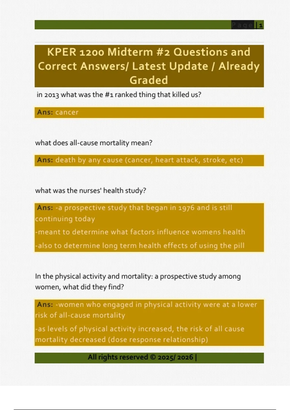 in 2013 what was the #1 ranked thing that killed us? Ans: cancer what does all-cause mortality mean? Ans: death by any cause (cancer, heart attack, stroke, etc) what was the nurses' health study? Ans: -a prospective study that began in 1976 and is still continuing today -meant to determine what factors influence womens health -also to determine long term health effects of using the pill In the physical activity and mortality: a prospective study among women, what did they find? Ans: -women who engaged in physical activity were at a lower risk of all-cause mortality -as levels of physical activity increased, the risk of all cause mortality decreased (dose response relationship) Page | 2 -risk of all-cause mortality decreased by approximately 20-30% as activity levels increased what did a systematic review (2008) about physical activity and mortality find? Ans: engaging in physical activity reduced the risk of all-cause mortality by 33% how many Canadians are expected to be diagnosed with cancer in their lifetime? Ans: nearly 1 in 2 (roughly 50%) how many Canadians are expected to die from cancer? Ans: 1 in 4 (about 25%) what is the most common type of cancer? Ans: lung cancer what type of cancer has the worst survival rates? Ans: pancreatic cancer All rights reserved © 2025/ 2026 | Page | 3 All rights reserved © 2025/ 2026 | after being diagnosed with cancer how many are expected to be alive in 5 years? Ans: 60% how could PA help cancer? Ans: 1. pre-cancer -PA could prevent a cancer diagnosis 2. post-cancer -PA could help people surive and thrive after a cancer diagnosis what is the second most common type of cancer? Ans: colon can