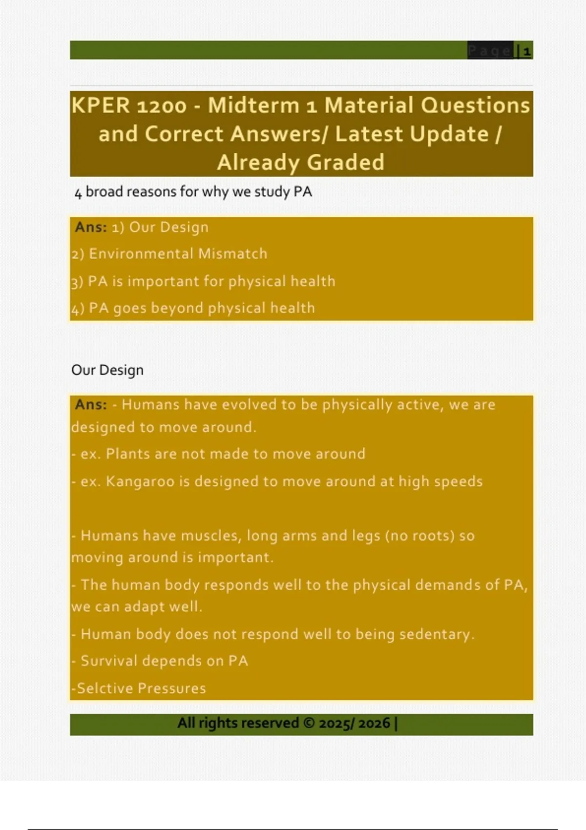 4 broad reasons for why we study PA Ans: 1) Our Design 2) Environmental Mismatch 3) PA is important for physical health 4) PA goes beyond physical health Our Design Ans: - Humans have evolved to be physically active, we are designed to move around. - ex. Plants are not made to move around - ex. Kangaroo is designed to move around at high speeds - Humans have muscles, long arms and legs (no roots) so moving around is important. - The human body responds well to the physical demands of PA, we can adapt well. - Human body does not respond well to being sedentary. - Survival depends on PA -Selctive Pressures Page | 2 All rights reserved © 2025/ 2026 | Selective Pressure Ans: - Environmental factors that affect the reproduction capabilities of a species. - ex. Giraffes have long neck, but there could have been a selective pressure for giraffes to need to be able to reach high for food (fires), those genes may have been transferred through generations. - example of selective pressures for giraffes: elevated food sources longer necked giraffes more likely to survive genes passed down - Selective pressures for humans: Finding water/ building shelter Escaping predation Transportation Environmental Mismatch Ans: - The selective pressures that favoured a capacity for physical activity are no longer present. Page | 3 All ri