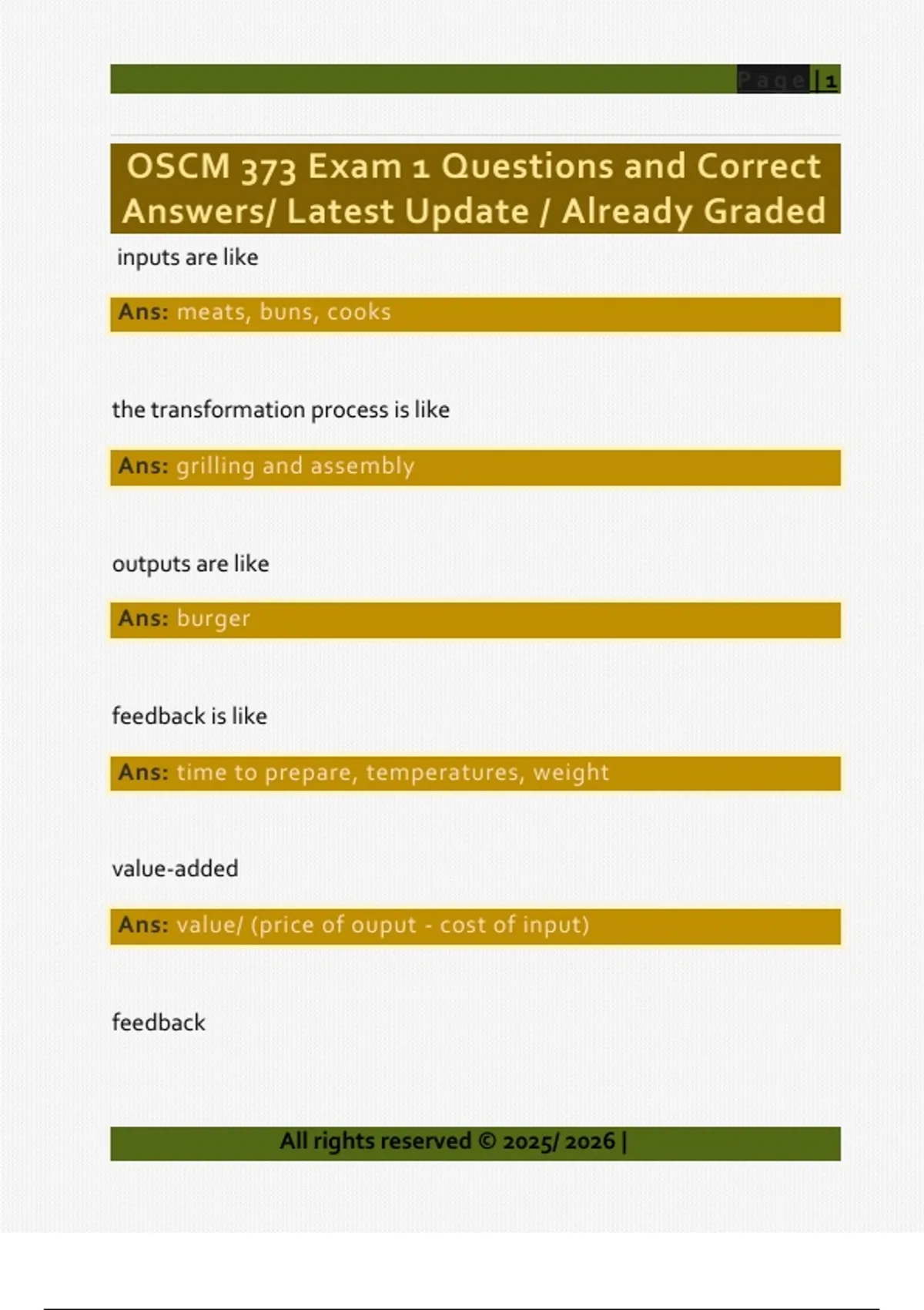 inputs are like Ans: meats, buns, cooks the transformation process is like Ans: grilling and assembly outputs are like Ans: burger feedback is like Ans: time to prepare, temperatures, weight value-added Ans: value/ (price of ouput - cost of input) feedback All rights reserved © 2025/ 2026 | Page | 2 All rights reserved © 2025/ 2026 | Ans: measurements taken at various points in the transformation process control Ans: the comparison of feedback against previously established standards to determine if corrective action is necessary manufacturing Ans: goods-oriented service Ans: act-oriented product package Ans: combinations of goods and services system design Ans: capacity, facility location, facility layout, and product and service planning - Usually require long-term commitment of resources Page | 3 All rights reserved © 2025/ 2026 | - Determine parameter of system operation systems operation Ans: generally tactical decisions: - Management of personnel - Inventory management and control - Scheduling - Project management - Quality assurance sources of waste Ans: - inventory - over-production - wait