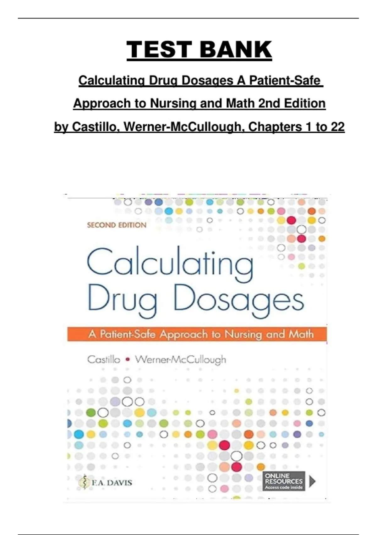 Test Bank – Calculating Drug Dosages: A Patient-Safe Approach to Nursing and Math (2nd Edition, Castillo & Werner-McCullough) – Chapters 1–22 Complete Assessment Material