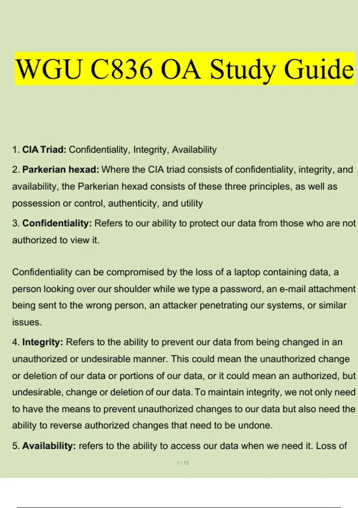 This document provides a complete and structured study guide for the WGU C836 OA exam, covering all major cybersecurity fundamentals. It includes clear explanations of security principles, attack types, access control models, cryptography, compliance standards, security tools, and operational processes. The material is designed as an all-in-one reference to support full exam preparation and reinforce core terminology and concepts required for success.