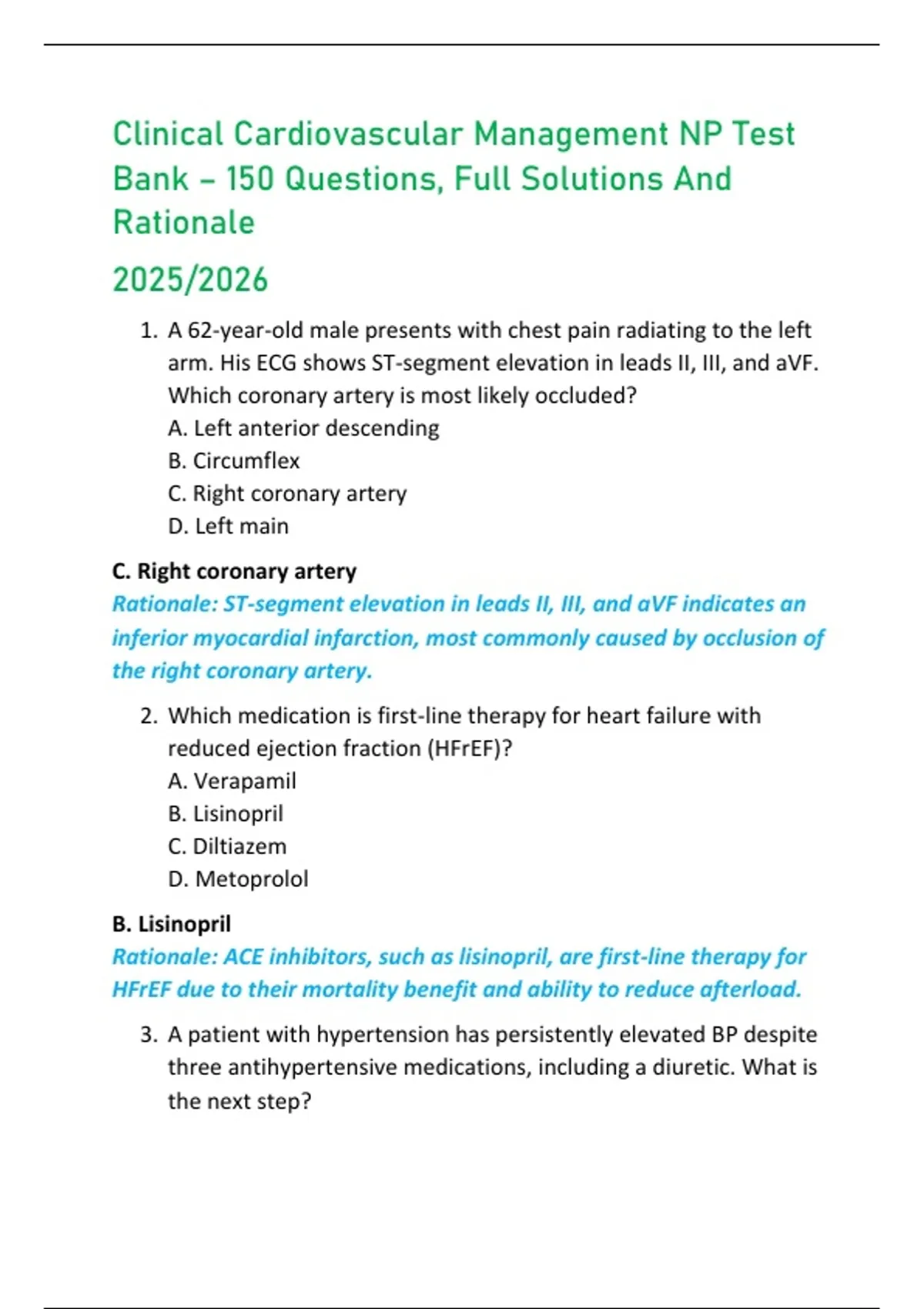 Clinical Cardiovascular Management NP Test Bank – 150 Questions, Full Solutions And Rationale 2025/2026