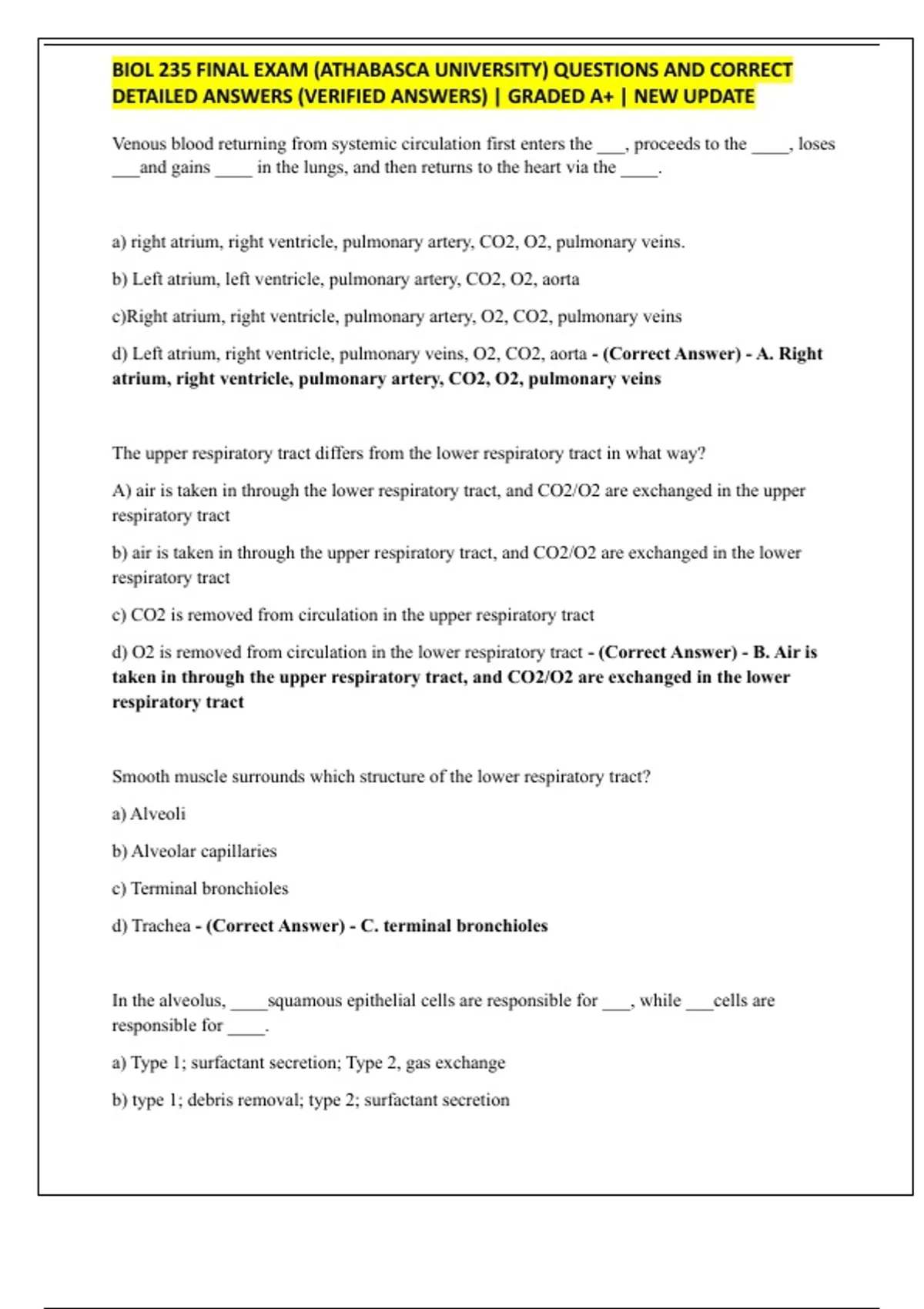 BIOL 235 FINAL EXAM (ATHABASCA UNIVERSITY) QUESTIONS AND CORRECT