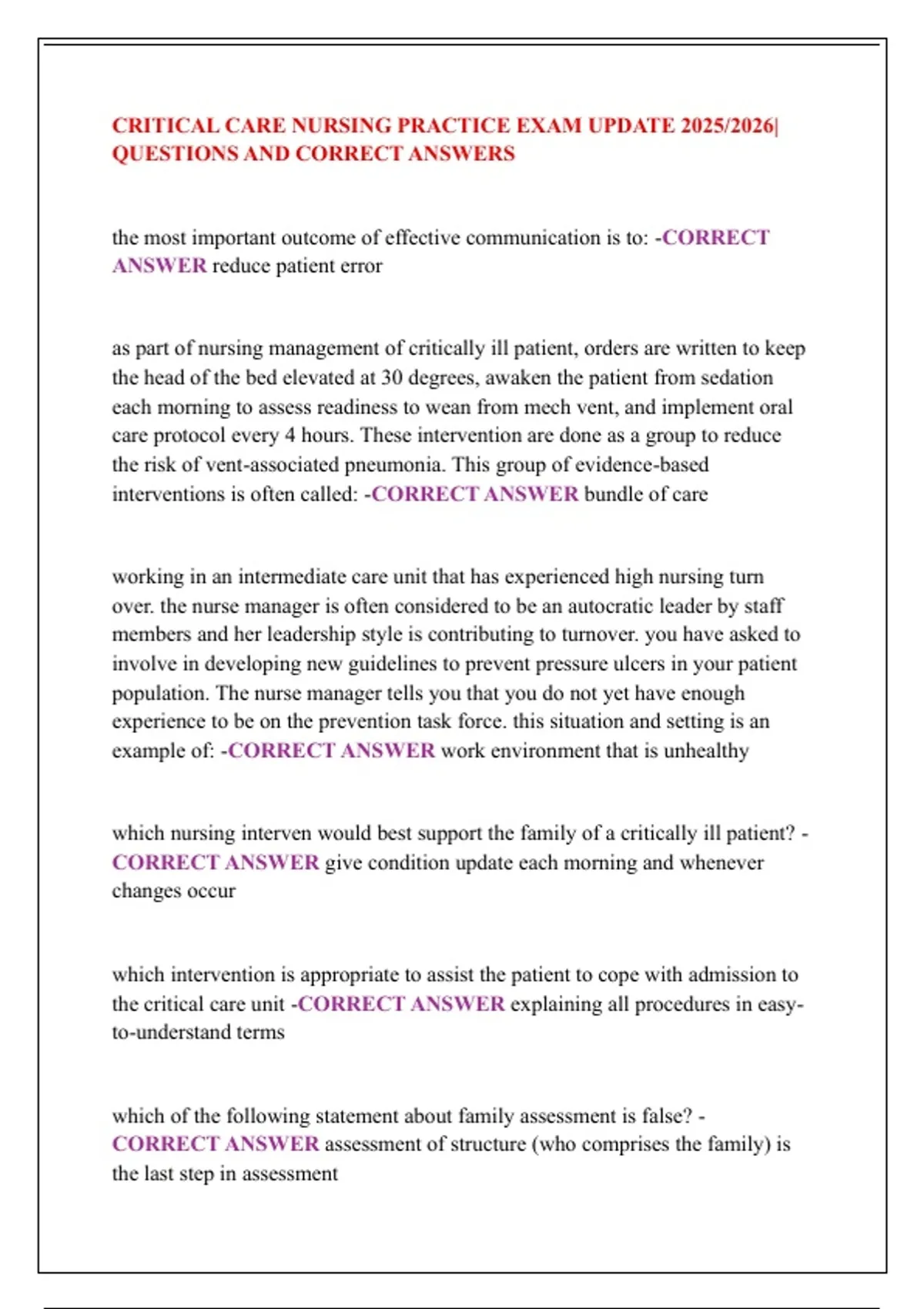 CRITICAL CARE NURSING PRACTICE EXAM UPDATE 2025/2026| QUESTIONS AND CORRECT ANSWERS