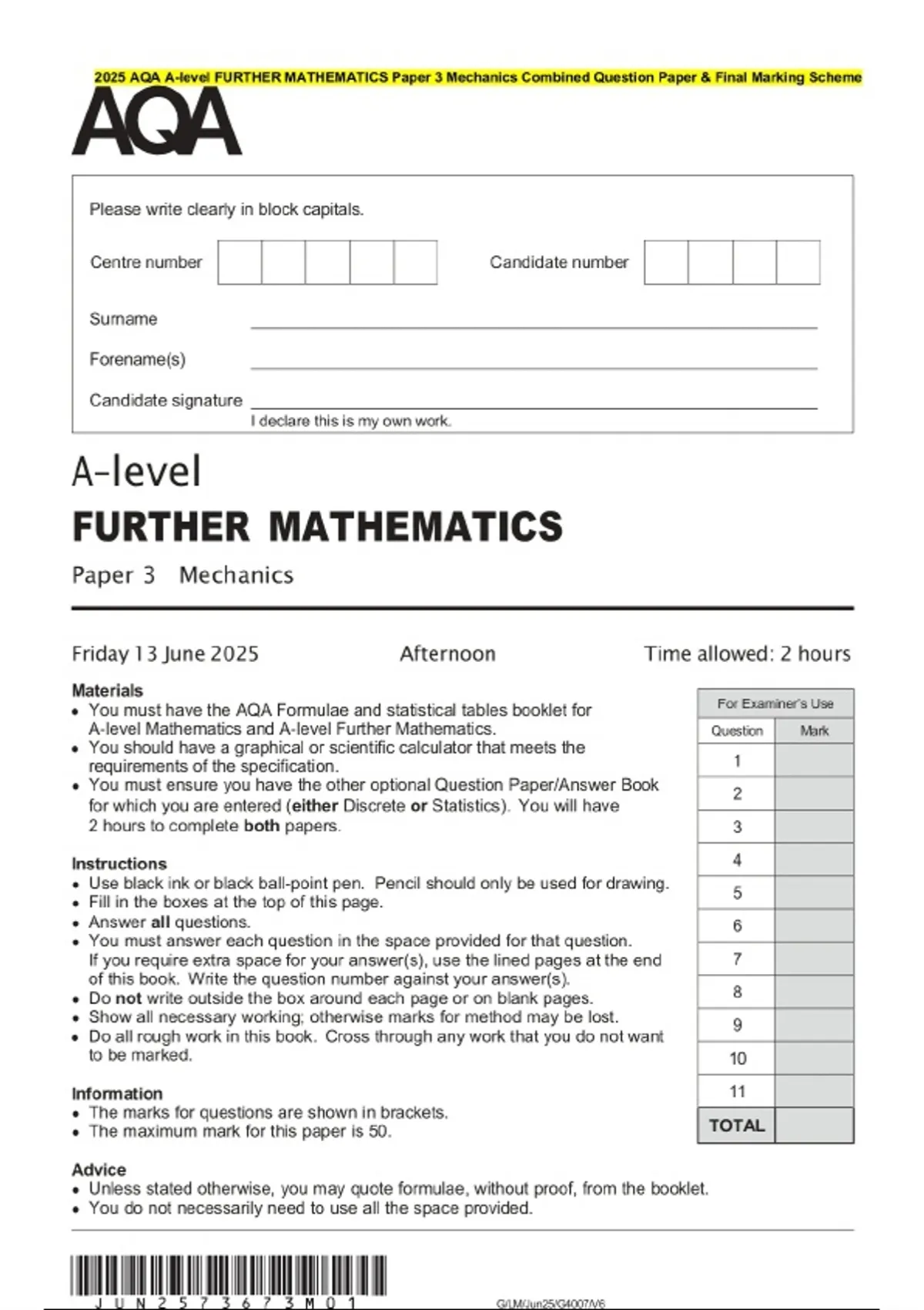 2025 AQA A-level FURTHER MATHEMATICS Paper 3 Mechanics Combined Question Paper & Final Marking Scheme