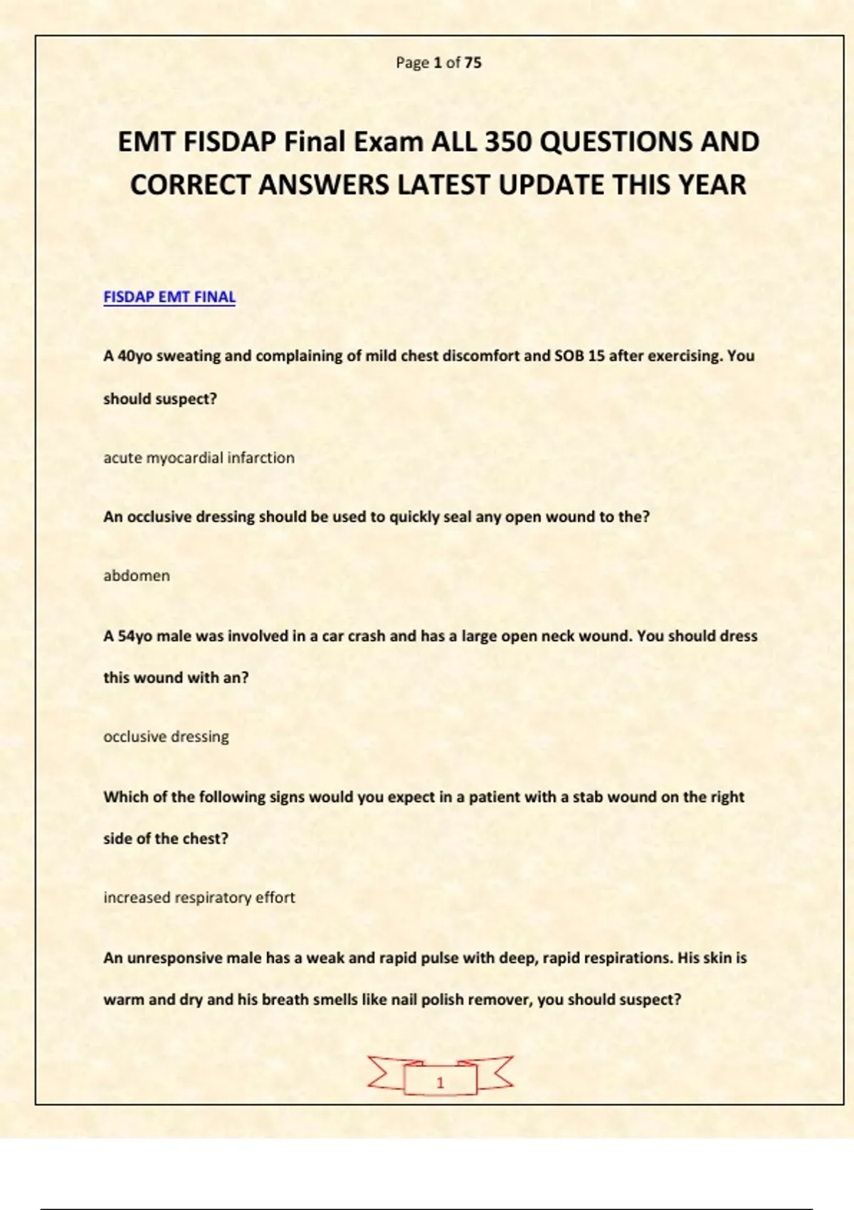 Tap on AVAILABLE IN BUNDLE/PACKAGE DEAL to unlock free bonus exams — save more while getting everything you need! You’ll be glad you did! The EMT FISDAP Final Exam – All 350 Questions and Correct Answers (Latest Update This Year) provides a fully updated collection of verified questions designed to help EMT students prepare for their comprehensive final exam. This resource covers critical topics including patient assessment, trauma care, medical emergencies, cardiology, respiratory management, pharmacology, and advanced life-saving interventions. Each question comes with the correct answer to reinforce knowledge, strengthen clinical reasoning, and enhance exam readiness. Ideal for EMT students preparing for FISDAP final exams, this tool ensures thorough preparation, confidence, and successful performance on certification assessments.