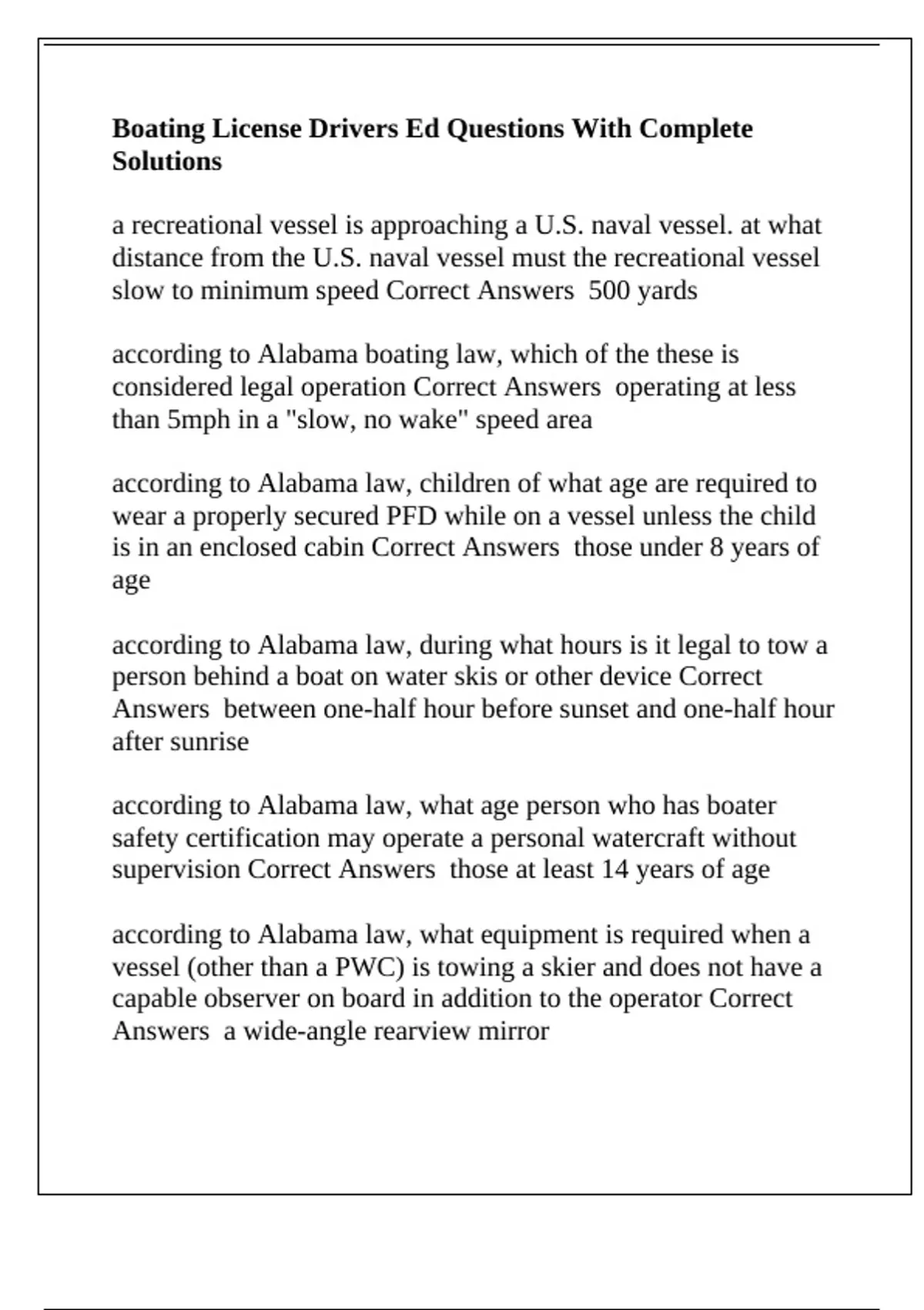 Boating License Drivers Ed Questions With Complete Solutions