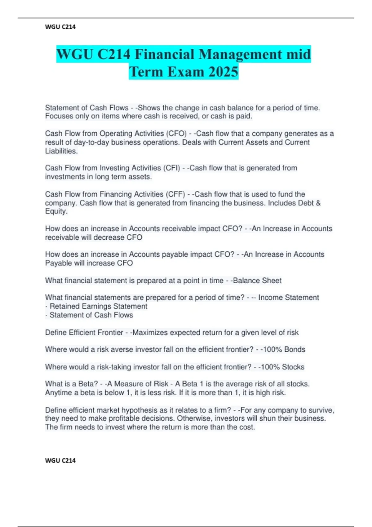 WGU C214 Financial Management mid Term Exam 2025 Statement of Cash Flows - -Shows the change in cash balance for a period of time. Focuses only on items where cash is received, or cash is paid. Cash Flow from Operating Activities (CFO) - -Cash flow that a company generates as a result of day-to-day business operations. Deals with Current Assets and Current Liabilities. Cash Flow from Investing Activities (CFI) - -Cash flow that is generated from investments in long term assets. Cash Flow from Financing Activities (CFF) - -Cash flow that is used to fund the company. Cash flow that is generated from financing the business. Includes Debt & Equity. How does an increase in Accounts receivable impact CFO? - -An Increase in Accounts receivable will decrease CFO How does an increase in Accounts payable impact CFO? - -An Increase in Accounts Payable will increase CFO What financial statement is prepared at a point in time - -Balance Sheet What financial statements are prepared for a period of time? - -· Income Statement · Retained Earnings Statement · Statement of Cash Flows Define Efficient Frontier - -Maximizes expected return for a given level of risk Where would a risk averse investor fall on the efficient frontier? - -100% Bonds Where would a risk-taking investor fall on the efficient frontier? - -100% Stocks What is a Beta? - -A Measure of Risk - A Beta 1 is the average risk of all stocks. Anytime a beta is below 1, it is less risk. If it is more than 1, it is high risk. Define efficient market hypothesis as it relates to a firm? - -For any company to survive, they need to make profitable decisions. Otherwise, investors will shun their business. The firm needs to invest where the return is more than the cost. WGU C214 WGU C214 What is the intrinsic value of a stock under efficient market hypothesis? - -The intrinsic value of stock is the present value of the stock's after tax net cash flows. Whenever the question states that dividend was paid recently or was just paid, what must be calculated first? - -Expected Dividend For every Bond question, what must be entered? - -FV must be entered as 1000 PMT must be entered as 1000 x Coupon Rate What is Capital Budgeting? - -Refers to long term investment decision making. Refers to the process used in making investment decisions involving projects that generate cash flows over a multi-year horizon. What information is needed for capital budgeting? - -Initial Outlay (How much money the company is going to invest in the company right now) Differential Annual Cash Flows (Cash flow that the project will generate year after year) Terminal Cash Flow (Cash flow generated at the end of the project) Define NPV? - -Net Present Value method is the method that is universally used by companies to evaluate long term investment decisions. NPV is defined as the present value of after-tax net tax flows and is most common used method in capital budgeting. The Net Present value should be positive in order for a company to proceed with an investment. If it is negative, the company should not proceed. Define IRR? - -Another method used for long term investment decisions is the internal rate of return (IRR) method. This method is considered inferior to NPV. Internal Rate of Return (IRR) is defined as the discount rate that results in a Zero Net Present Value. Define Free Cash Flow - -Cash flows from operating activities minus cash necessary for reinvestment in PPE. Free cash flows represent Cash available for distribution after funding required reinvestment What ratio is used to value a firm using the comparables method? - -P/E Ratio or Price/Earnings Ratio Define WACC - -Weighted Average Cost of Capital. The WACC is the weighted average of the various costs of equity and costs of debt. How does a rating downgrade/upgrade impact the cost of capital? - -A positive credit rating lowers the cost of capital and a negative credit rating increases the cost of capital. Define DFN - -Discretionary Financing Needed. The difference between total assets and total liabilities and owner's equity is referred to as discretionary financing needed. In WGU C214 WGU C214 other words, this is the amount of discretionary financing that the firm thinks it will need to raise in the next year. What is the risk posed by excessive debt? - -Excessive debt can lead to a company not able to meet its financial obligations to pay back liabilities or result in potential bankruptcy. What is the relationship between increases or decreases in sales revenue and increases or decreases in EBIT? - -There is a direct relationship between sales revenue and EBIT. Any change in sales will magnify EBIT in either direction. If there is an increase in sales revenue EBIT will go up. If there is a decrease in sales revenue, EBIT will go down. How do firms manage working capital? - -Try to collect funds as quickly from customers as possible and pay bills as slowly as possible. What ratios are used to determine effective working capital management? - -- Current Ratio - Cash Ratio - Receivables Turnover Ratio Name two basic types of financial instruments? - -Stocks and Bonds What are Primary Markets? - -Where companies sell securities directly to investors What are Secondary Markets? - -Where securities are bought and sold from third parties like the New York Stock Exchange Name two types of secondary markets? - -New York Stock Exchange (NYSE) and th