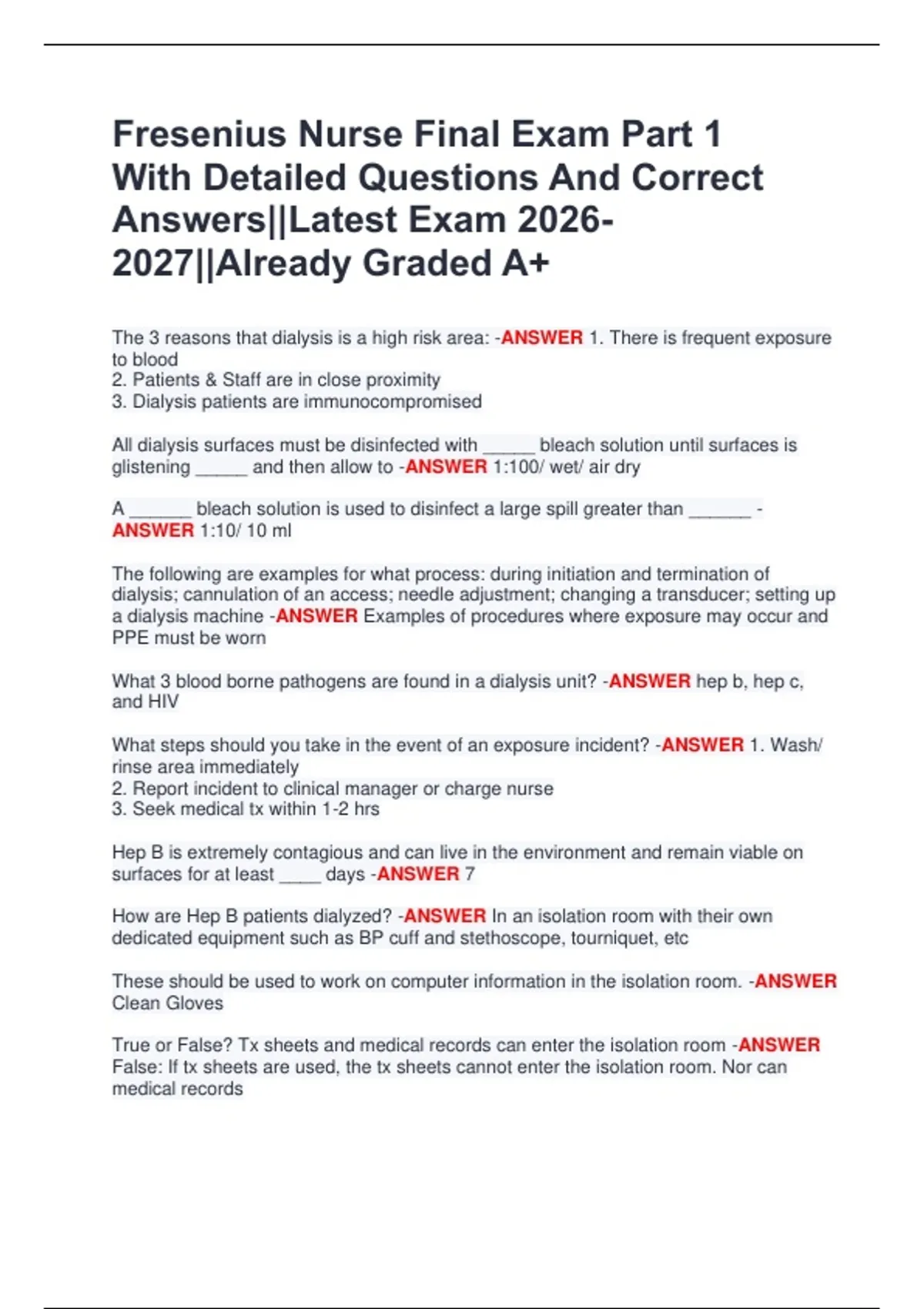 Fresenius Nurse Final Exam Part 1 With Detailed Questions And Correct Answers||Latest Exam ||Already Graded A+