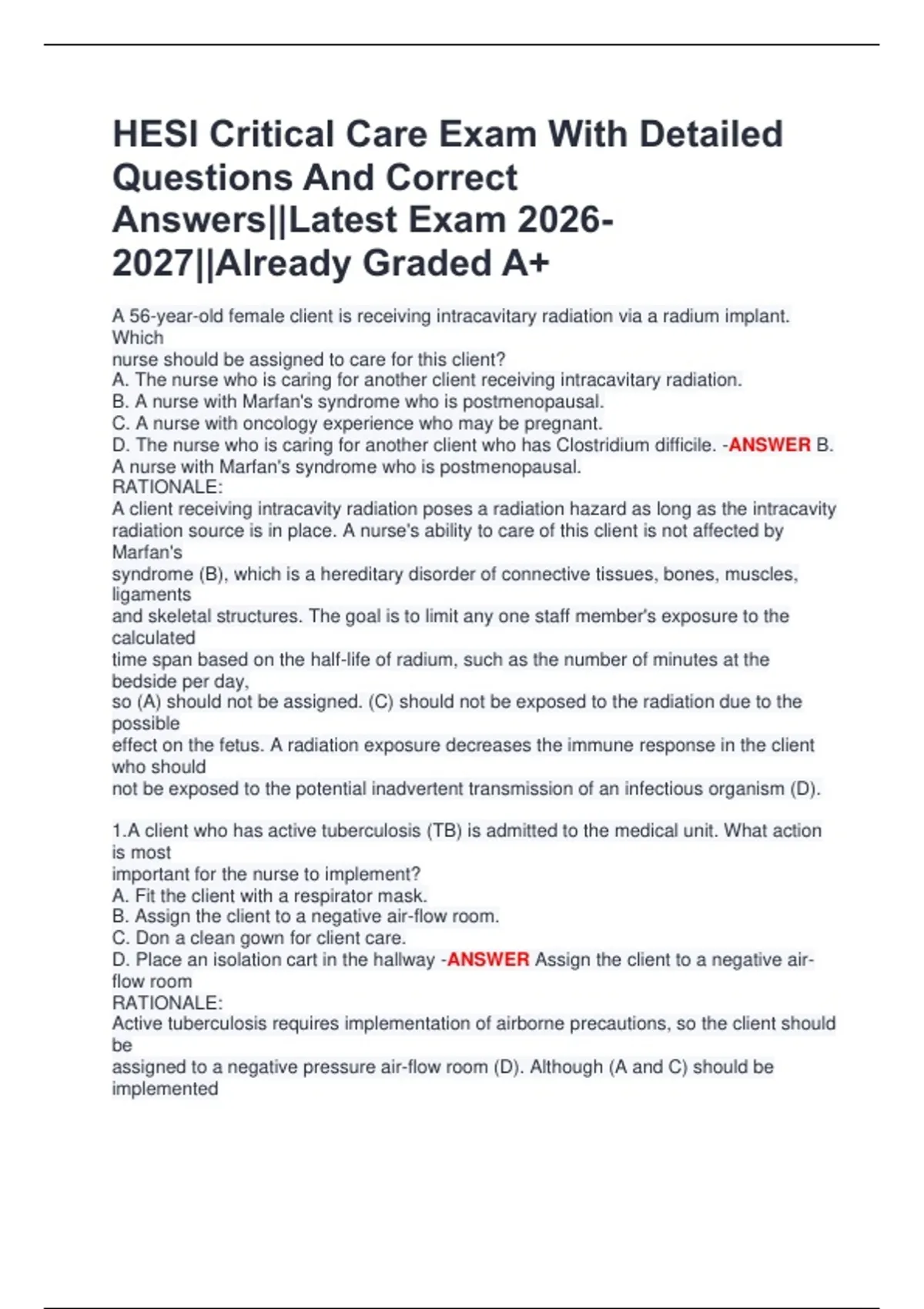 HESI Critical Care Exam With Detailed Questions And Correct Answers||Latest Exam 2026 2027||Already Graded A+