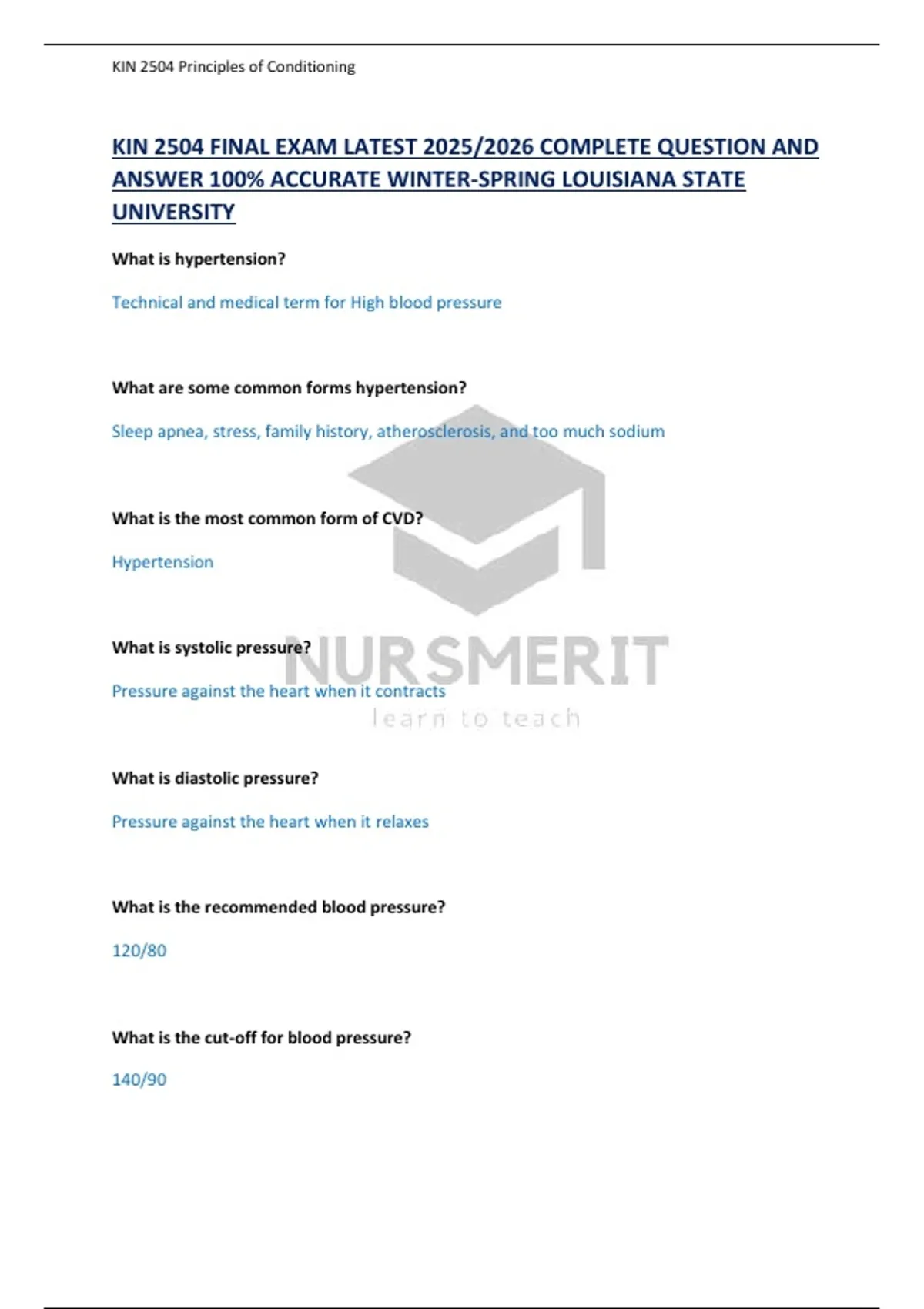 KIN 2504 FINAL EXAM LATEST 2025/2026 COMPLETE QUESTION AND ANSWER 100% ACCURATE WINTER-SPRING LOUISIANA STATE UNIVERSITY