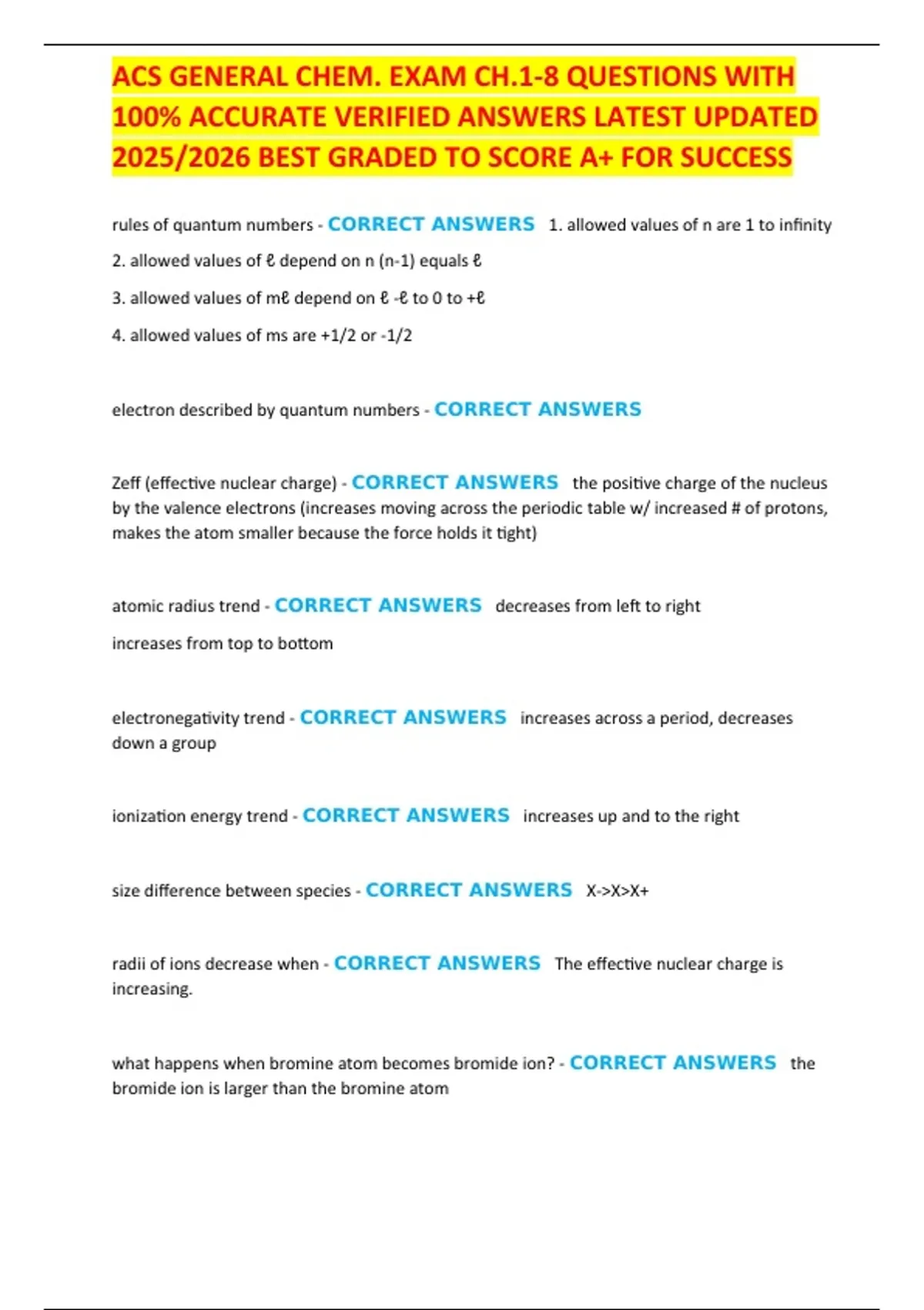 , ACS GENERAL CHEM. EXAM CH.1-8 QUESTIONS WITH