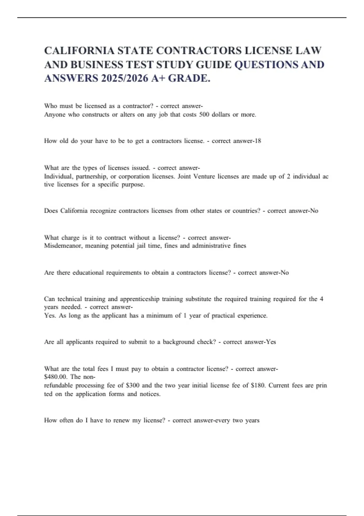 CALIFORNIA STATE CONTRACTORS LICENSE LAW AND BUSINESS TEST STUDY GUIDE QUESTIONS AND ANSWERS 2025/2026 A+ GRADE.