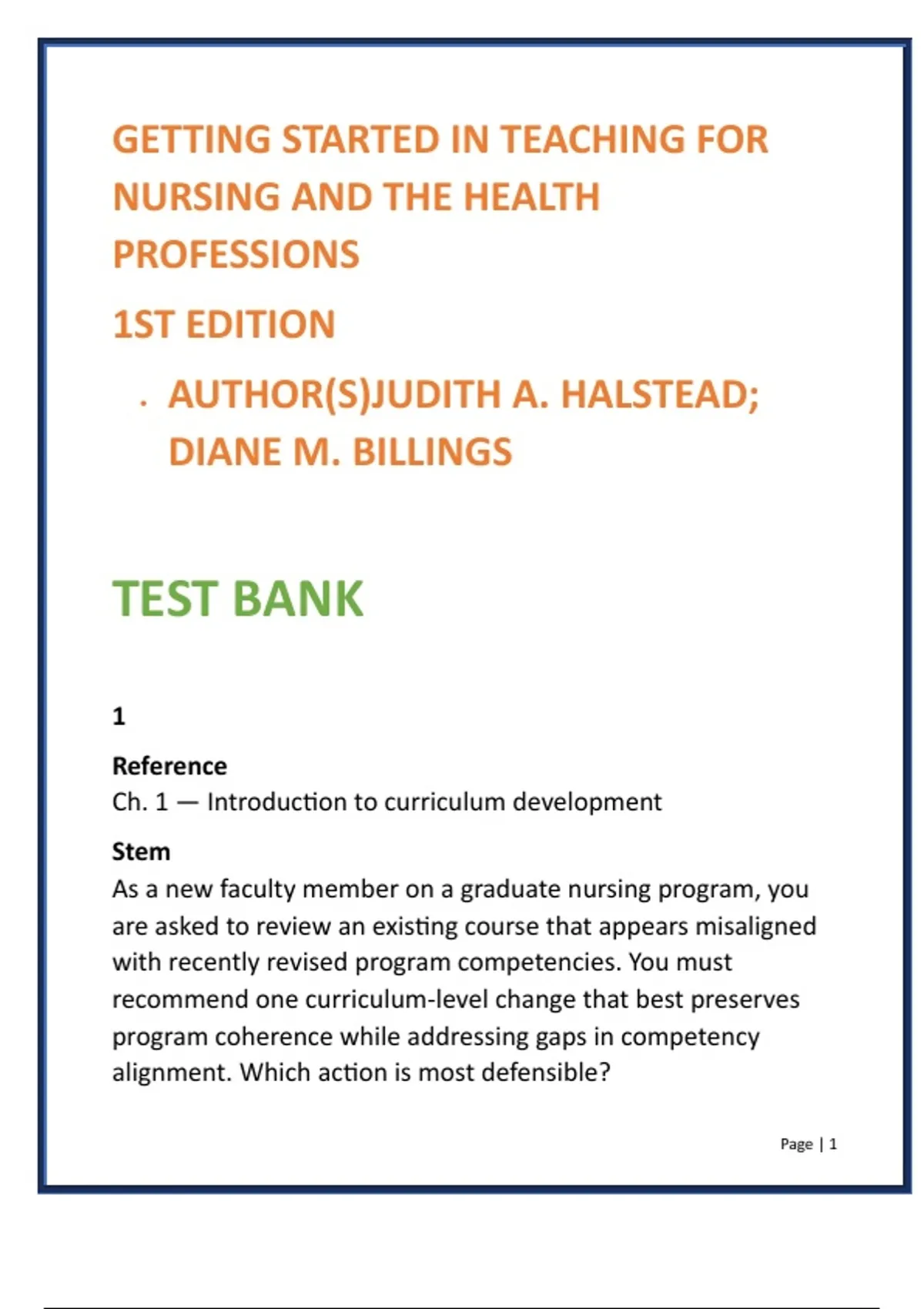 Getting Started in Teaching for Nursing & Health Professions Test Bank 2025 | 20 MCQs/Chapter | Halstead & Billings Educator Exam Prep 2) SEO Product Description (200–300 words) Elevate your teaching effectiveness with the Getting Started in Teaching for Nursing and the Health Professions — Test Bank 2025, a comprehensive digital assessment resource built for graduate-level nursing education and faculty development programs. This professional-grade item bank delivers 20 high-quality MCQs per chapter, each crafted to reflect the competencies and instructional expectations outlined in the 2025 Halstead & Billings text. Designed for MSN-Education learners, PhD in Nursing Education students, new faculty, clinical instructors, and allied health educators, this test bank supports mastery of foundational and advanced educator skills. Every question includes verified correct answers and evidence-based rationales, helping learners strengthen curriculum design expertise, assessment literacy, simulation pedagogy, instructional planning, and learner evaluation skills across classroom, clinical, online, and lab environments. This resource reinforces the knowledge needed for confident role transition into academia, improved lesson planning, enhanced instructional decision-making, and deeper understanding of teaching–learning principles central to nursing and health professions education. Key Features • Full-chapter coverage aligned to the 2025 Halstead & Billings edition • 20 MCQs per chapter with verified answers and rationales • Graduate-level educator competencies: curriculum development, instructional design, clinical teaching, simulation facilitation, assessment strategies, and technology-enhanced learning • Ideal for MSN-Education, PhD in Nursing Education, faculty onboarding, allied health educator training, and continuing professional development • Strengthens teaching confidence, planning efficiency, and academic role socialization • Suitable for coursework, exam preparation, competency evaluation, and instructional skill enhancement Optimize your academic performance and educator readiness with this gold-standard, evidence-aligned teaching test bank. 3) 8 High-Value SEO Keywords nursing educator test bank 2025 health professions teaching questions Halstead Billings test bank faculty development exam prep graduate nursing education test bank teaching in nursing assessment questions educator competencies MCQs curriculum development test bank 4) 10 Hashtags #NursingEducation #FacultyDevelopment #HealthProfessionsTeaching #NurseEducatorPrep #TeachingInNursing #GraduateNursing #MSNEducation #PhDNursingEducation #EducatorTestBank #NursingExamPrep
