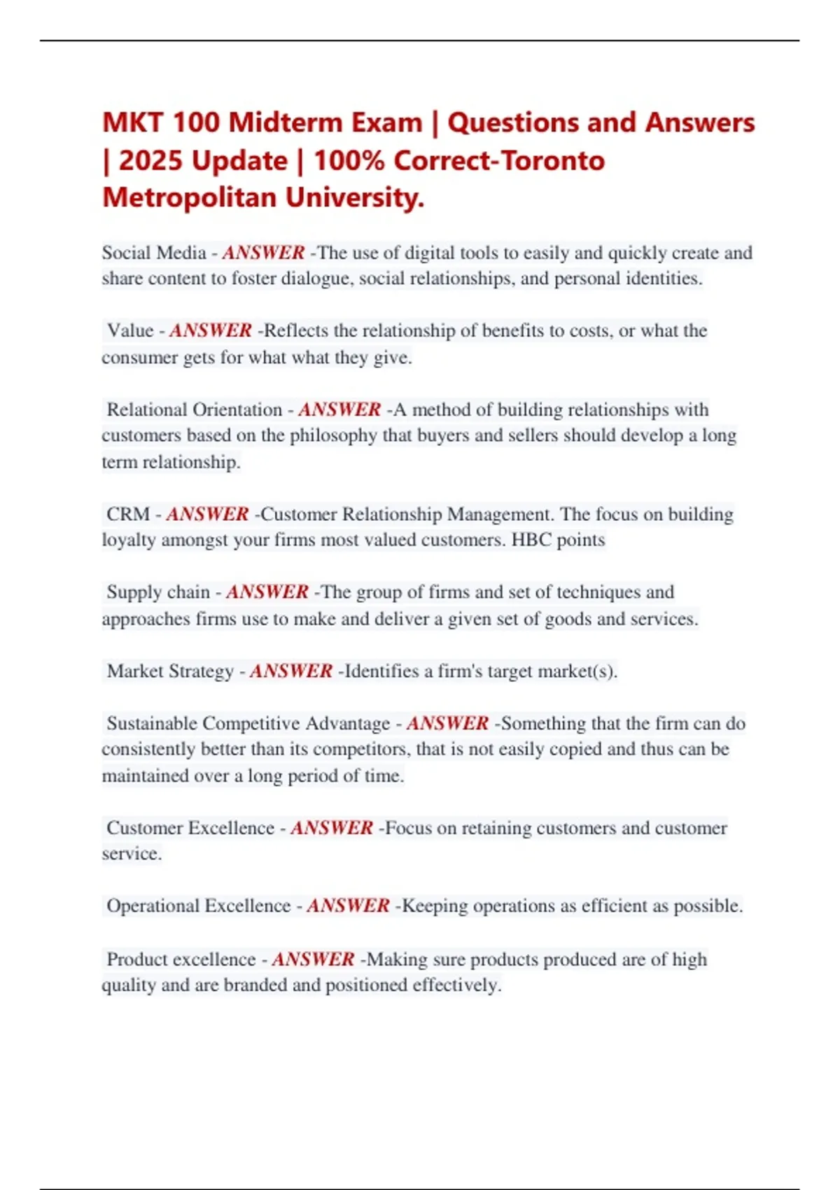 MKT 100 Midterm Exam | Questions and Answers | 2025 Update | 100% Correct-Toronto Metropolitan University. Social Media - ANSWER -The use of digital tools to easily and quickly create and share content to foster dialogue, social relationships, and personal identities. Value - ANSWER -Reflects the relationship of benefits to costs, or what the consumer gets for what what they give. Relational Orientation - ANSWER -A method of building relationships with customers based on the philosophy that buyers and sellers should develop a long term relationship. CRM - ANSWER -Customer Relationship Management. The focus on building loyalty amongst your firms most valued customers. HBC points Supply chain - ANSWER -The group of firms and set of techniques and approaches firms use to make and deliver a given set of goods and services. Market Strategy - ANSWER -Identifies a firm's target market(s). Sustainable Competitive Advantage - ANSWER -Something that the firm can do consistently better than its competitors, that is not easily copied and thus can be maintained over a long period of time. Customer Excellence - ANSWER -Focus on retaining customers and customer service. Operational Excellence - ANSWER -Keeping operations as efficient as possible. Product excellence - ANSWER -Making sure products produced are of high quality and are branded and positioned effectively. Location Excellence - ANSWER -A focus on a good physical location, and internet presence. Planning Phase - ANSWER -When marketers define the missions of their business. This is the assessing phase. Implementation Phase - ANSWER -When all plans and missions come into fruition. Control Phase - ANSWER -The part of the strategic marketing planners process when managers evaluate the performance of the market strategy and take necessary corrective actions. SWOT - ANSWER -Strengths, Weaknesses, Opportunities, Threats. The second step in a marketing plan. STP - ANSWER -Segmentation, Targeting, and Positioning that firms use to identify and evaluate opportunities for increasing sales and profit. Market Segment - ANSWER -A group of consumers who respond similarly to a firms marketing efforts. Market Segmentation - ANSWER -The process of dividing a market into distinct groups of customers, where each individual group has its needs met. An example is a car rental company, they have a car for everyones needs. Market Positioning - ANSWER -Defining your business and making your traits known. An example is that Hertz car rental company is know for a good quality, and reliable car rental company. SBU - ANSWER -Strategic Business Unit. A division of a company that can be managed somewhat independently from other divisions since it markets a specific set of products to a clearly defined group of consumers. An example is how Loblaws carries multiple different departments under one roof. Product line - ANSWER -A group of products that may be used in conjunction to each other or are perceived to be in the same group. An example would be PC banking, which includes credit cards, insurance, and banking, but people associate them to be all connected. Relative Market Share - ANSWER -The measure of a products strength and success in a particular market. Market Growth Rate - ANSWER -The rate of growth of the specific market in which the product competes. Marketing Penetration Strategy - ANSWER -A growth strategy that employs the existing marketing mix and focuses on existing customers. Market Development strategy - ANSWER -A growth strategy that employs the existing marketing offering to new market segments not yet serviced by the firm. Product Development Strategy - ANSWER -A growth strategy that offers a new product to the firms already existing target market. Diversification Strategy - ANSWER -A growth strategy that is used when a firm introduces a new product or service to a market segment that it does not currently serve. Competitive intelligence - ANSWER -Used by firms to collect information about their position with respect to their rivals. Allows companies to anticipate future changes. Macroenviromental Factors - ANSWER -Aspects of the external environment, culture, demographics, social trends, technological advances and economic situations, and political/legal environment that affects companies.
