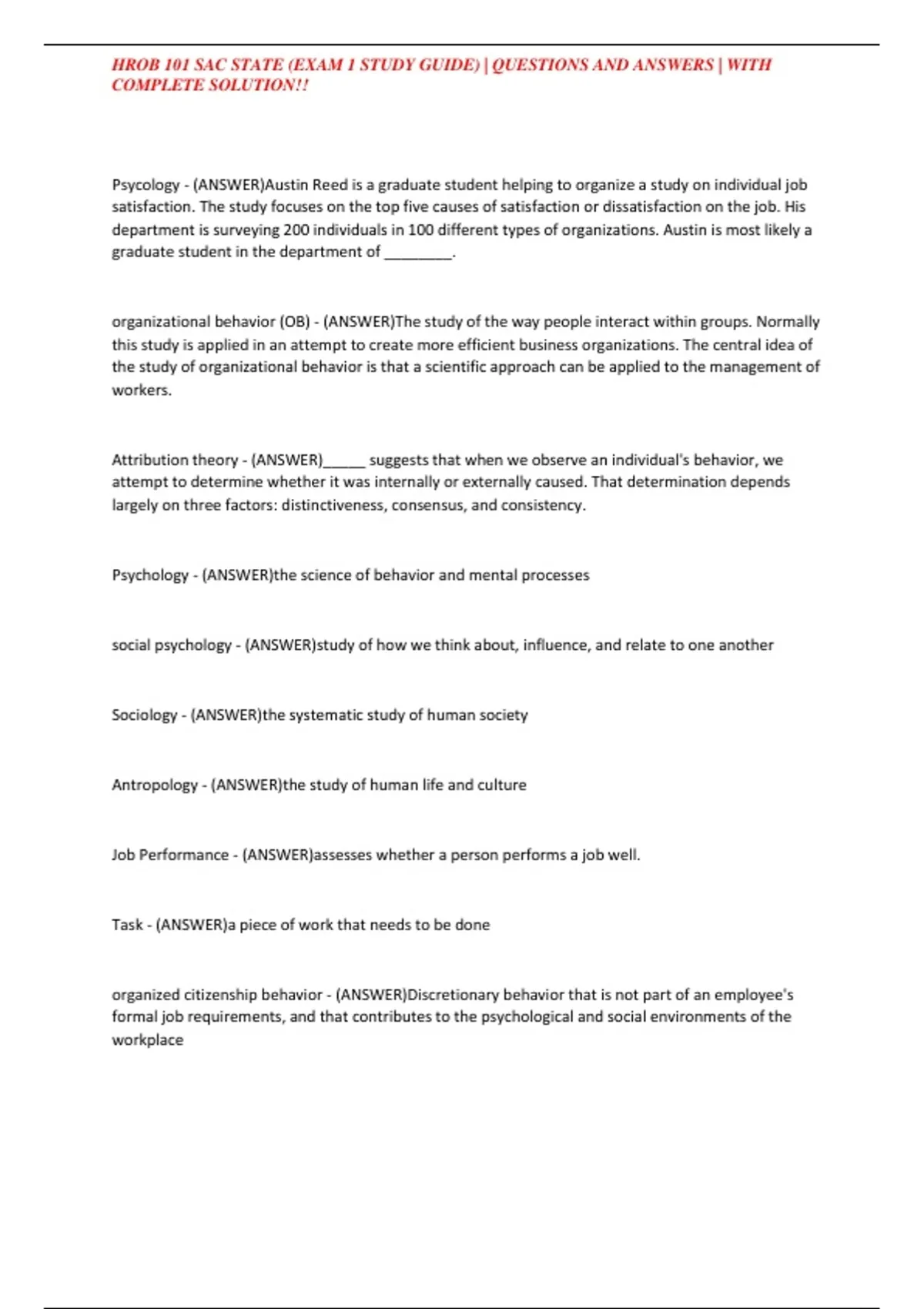 , HROB 101 SAC STATE (EXAM 1 STUDY GUIDE) | QUESTIONS AND ANSWERS | WITH