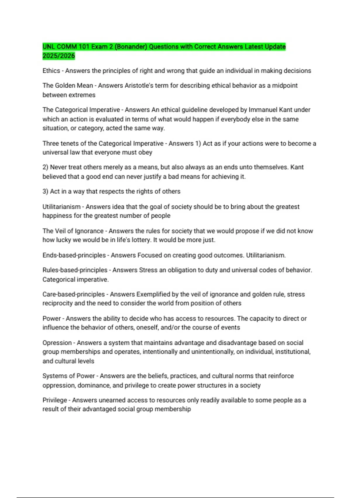UNL COMM 101 Exam 2 (Bonander) Questions with Correct Answers Latest Update 2025/2026 Ethics - Answers the principles of right and wrong that guide an individual in making decisions The Golden Mean - Answers Aristotle's term for describing ethical behavior as a midpoint between extremes The Categorical Imperative - Answers An ethical guideline developed by Immanuel Kant under which an action is evaluated in terms of what would happen if everybody else in the same situation, or category, acted the same way. Three tenets of the Categorical Imperative - Answers 1) Act as if your actions were to become a universal law that everyone must obey 2) Never treat others merely as a means, but also always as an ends unto themselves. Kant believed that a good end can never justify a bad means for achieving it. 3) Act in a way that respects the rights of others Utilitarianism - Answers idea that the goal of society should be to bring about the greatest happiness for the greatest number of people The Veil of Ignorance - Answers the rules for society that we would propose if we did not know how lucky we would be in life's lottery. It would be more just. Ends-based-principles - Answers Focused on creating good outcomes. Utilitarianism. Rules-based-principles - Answers Stress an obligation to duty and universal codes of behavior. Categorical imperative. Care-based-principles - Answers Exemplified by the veil of ignorance and golden rule, stress reciprocity and the need to consider the world from position of others Power - Answers the ability to decide who has access to resources. The capacity to direct or influence the behavior of others, oneself, and/or the course of events Opression - Answers a system that maintains advantage and disadvantage based on social group memberships and operates, intentionally and unintentionally, on individual, institutional, and cultural levels Systems of Power - Answers are the beliefs, practices, and cultural norms that reinforce oppression, dominance, and privilege to create power structures in a society Privilege - Answers unearned access to resources only readily available to some people as a result of their advantaged social group membership Class - Answers a system of ordering a society in which people are divided based on perceived social class or economic status Hegemony - Answers the dominance of one group over another, often supported by legitimizing norms and ideas. Ex: hegemonic masculinity Patriarchy - Answers a social system in which father or male elder has absolute authority over the family group specifically Social Change - Answers occurs when systems of power ingrained in society are confronted or attempt to be altered Micro Agression - Answers are the everyday verbal, nonverbal, and environmental slights, snubs, or insults, whether intentional or unintentional, that communicate hostile, derogatory, or negative messages to target persons based solely upon their marginalized group membership Elected Leader - Answers although used by groups of all sizes, this proce