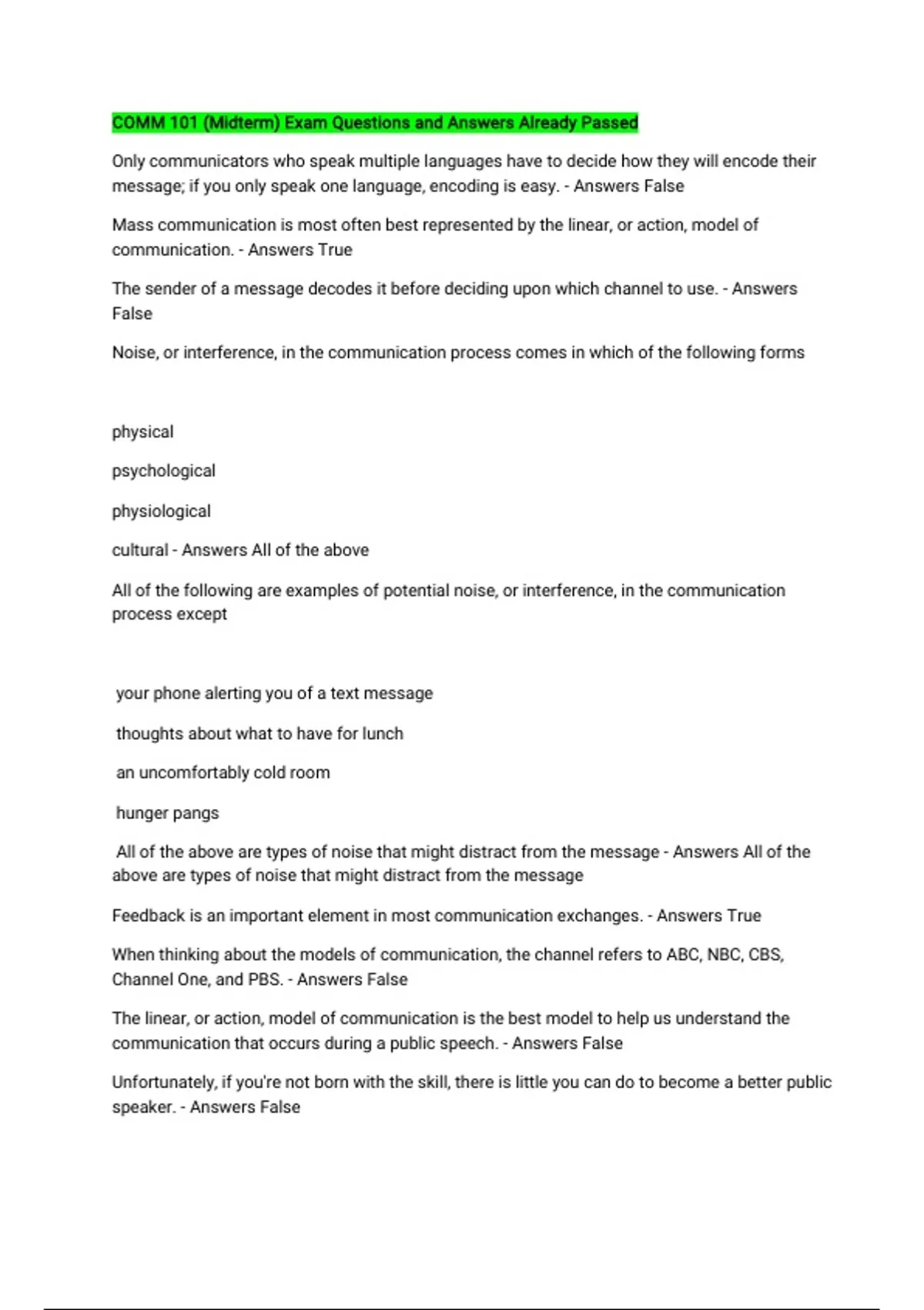 COMM 101 (Midterm) Exam Questions and Answers Already Passed Only communicators who speak multiple languages have to decide how they will encode their message; if you only speak one language, encoding is easy. - Answers False Mass communication is most often best represented by the linear, or action, model of communication. - Answers True The sender of a message decodes it before deciding upon which channel to use. - Answers False Noise, or interference, in the communication process comes in which of the following forms physical psychological physiological cultural - Answers All of the above All of the following are examples of potential noise, or interference, in the communication process except your phone alerting you of a text message thoughts about what to have for lunch an uncomfortably cold room hunger pangs All of the above are types of noise that might distract from the message - Answers All of the above are types of noise that might distract from the message Feedback is an important element in most communication exchanges. - Answers True When thinking about the models of communication, the channel refers to ABC, NBC, CBS, Channel One, and PBS. - Answers False The linear, or action, model of communication is the best model to help us understand the communication that occurs during a public speech. - Answers False Unfortunately, if you're not born with the skill, there is little you can do to become a better public speaker. - Answers False Communicators always share the same context when communicating with one another. - Answers False Public speaking skills can help individuals create awareness for important issues facing their communities. - Answers True Communication with yourself is known as - Answers Intrapersonal When delivering a speech, we normally receive feedback through __________ channels. - Answers Nonverbal The type of communication in which one person or group delivers a message face-to-face to an audience is - Answers public speaking All of the following are reasons to study public speaking except positivity personal public professional All of the above are reasons to study public speaking - Answers positivity A guiding belief of worth, importance, or desirableness that regulates our attitudes is a(n) - Answers value Knowing your audience is the single most important aspect of speech preparation and delivery. - Answers true Which of the following steps in the speech preparation process might need to be adapted based upon who is in the audience? topic sources delivery language all of the above none of the above - Answers all of the above When performing an audience analysis for an unacquainted-audience presentation, you should use direct observation and interviews. - Answers false Value-ordered questions help you to determine your audience's assessment of items in relation to one another. - Answers true In a speech to a diverse audience, many of whom speak English as their second language, you should use jargon to help them better understand your speech. - Answers false Ethnocentrism is the assumption that your culture is better than other cultures and is the standard by which all other cultures should be judged. - Answers true An effective speaker learns as much about his audience as he can so he is able to pander to the audience. - Answers false Audience analysis by data sampling requires you to survey your audience before you give your speech. - Answers true If you want to know the age, gender, education, income, and occupation of your audience members, you will need to perform a - Answers demographic audience analysis A psychological analysis of your audience seeks to identify the audience's attitudes, beliefs, and values. - Answers true Newman wanted to measure the intensity level with which the audience agrees or disagrees with his stance on Sunday mail delivery. The best type of survey question for him to use would be - Answers a scale, or likert-type, question One of the dangers of relying solely on demographics when preparing for a delivering your speech is you might inappropriately and/or offensively stereotype your audience you'll miss specific details unique to your audience and, as a result, give an ineffective speech you'll give a speech inappropriate to the age of your audience you won't be able to adapt your speech to their education level all of the above are dangers of relying solely on demographics only a & b are dangers of relying solely on demographics - Answers only a & b are dangers of relying solely on demographics