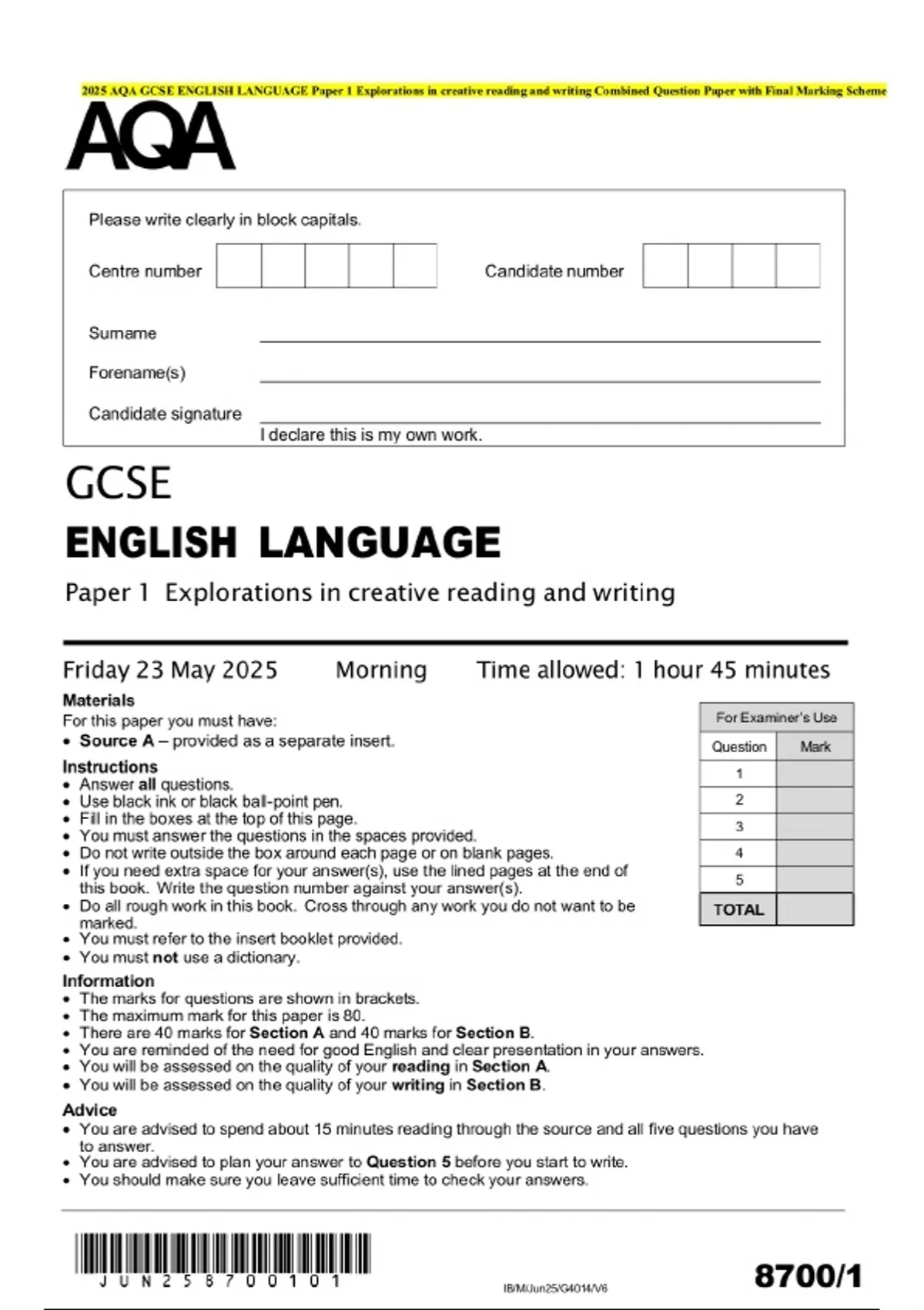 2025 AQA GCSE ENGLISH LANGUAGE Paper 1 Explorations in creative reading and writing Combined Question Paper with Final Marking Scheme