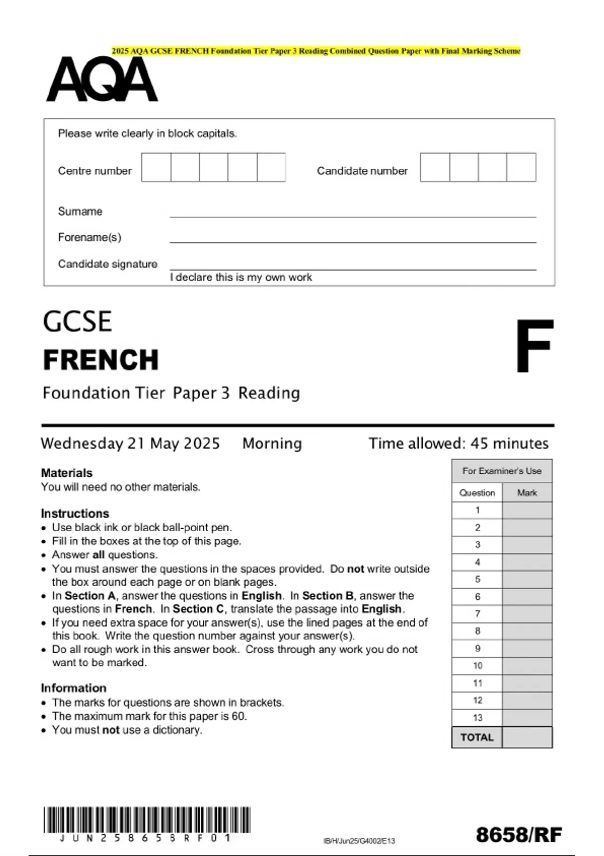 2025 AQA GCSE FRENCH Foundation Tier Paper 3 Reading Combined Question Paper with Final Marking Scheme