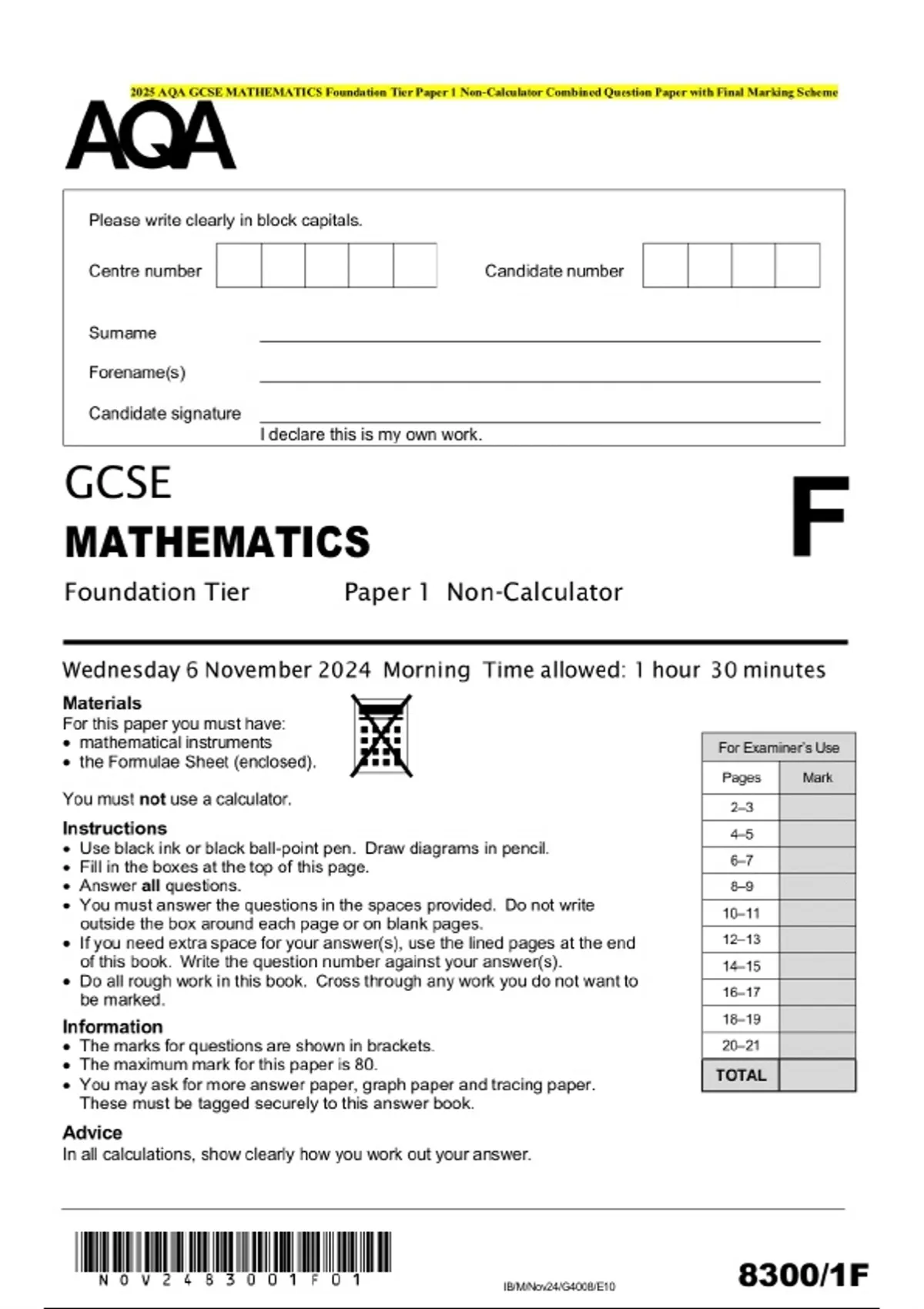 2025 AQA GCSE MATHEMATICS Foundation Tier Paper 1 Non-Calculator Combined Question Paper with Final Marking Scheme