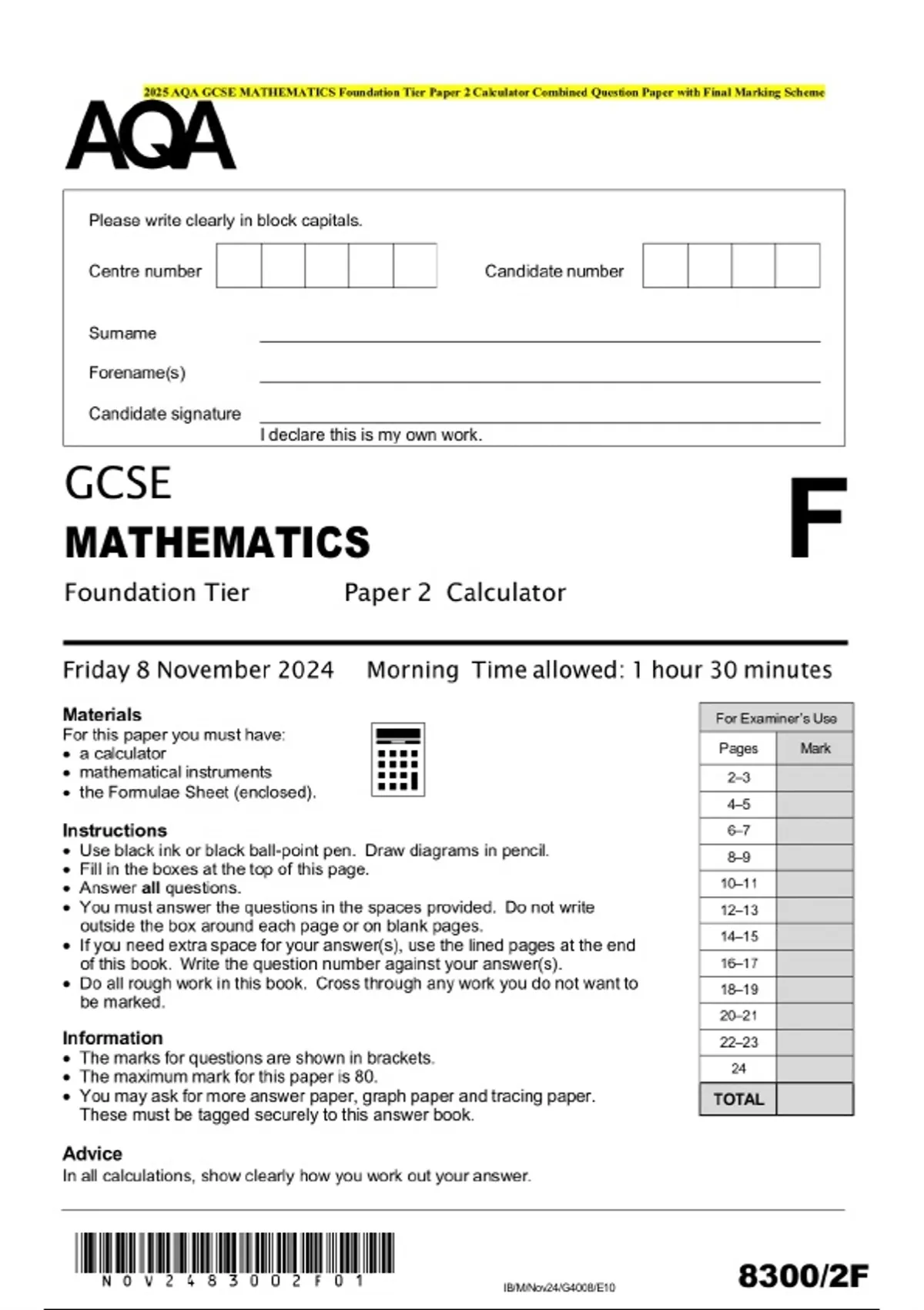 2025 AQA GCSE MATHEMATICS Foundation Tier Paper 2 Calculator Combined Question Paper with Final Marking Scheme