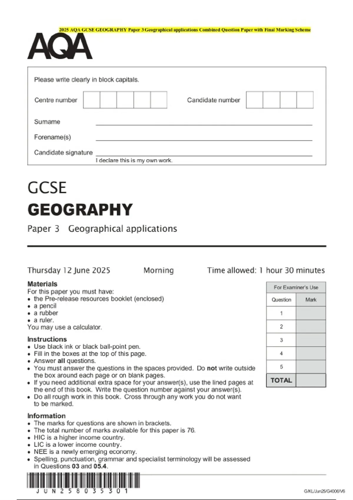 2025 AQA GCSE GEOGRAPHY Paper 3 Geographical applications Combined Question Paper with Final Marking Scheme