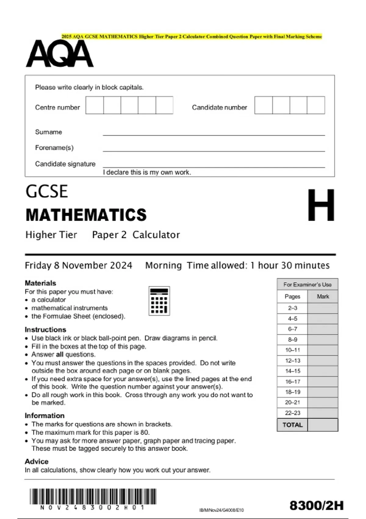 2025 aqa gcse mathematics higher tier paper 2 calc