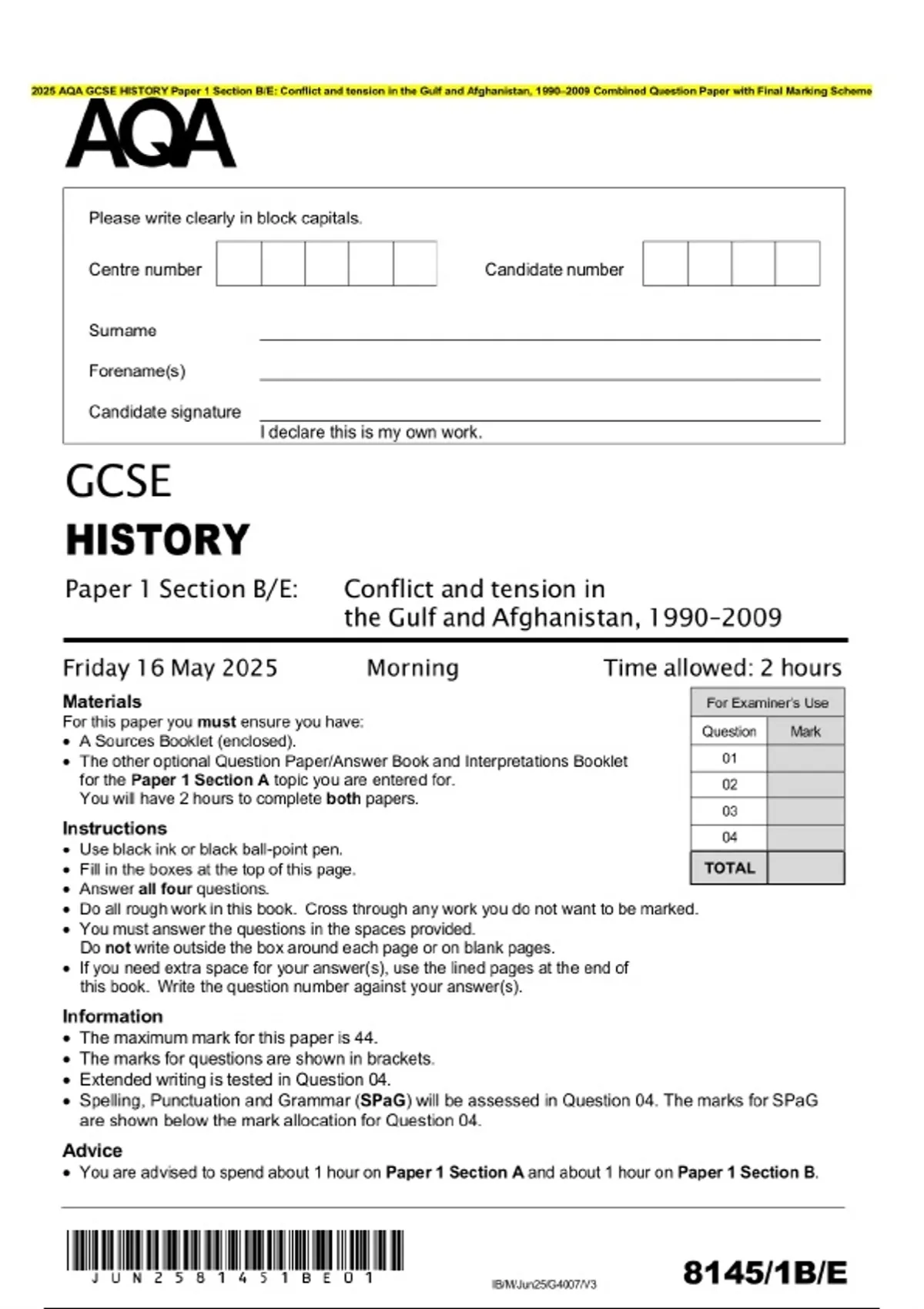 2025 AQA GCSE HISTORY Paper 1 Section B/E: Conflict and tension in the Gulf and Afghanistan, 1990–2009 Combined Question Paper with Final Marking Scheme