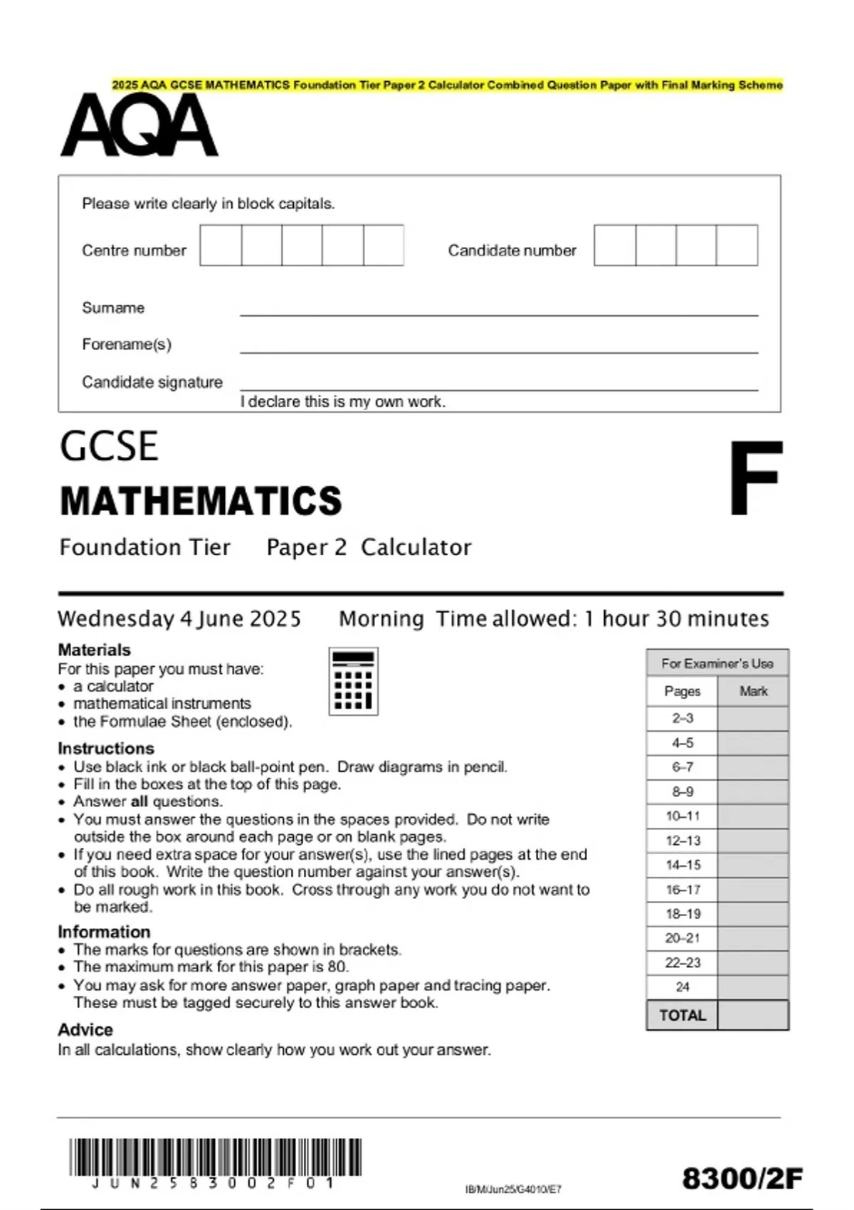2025 AQA GCSE MATHEMATICS Foundation Tier Paper 2 Calculator Combined Question Paper with Final Marking Scheme