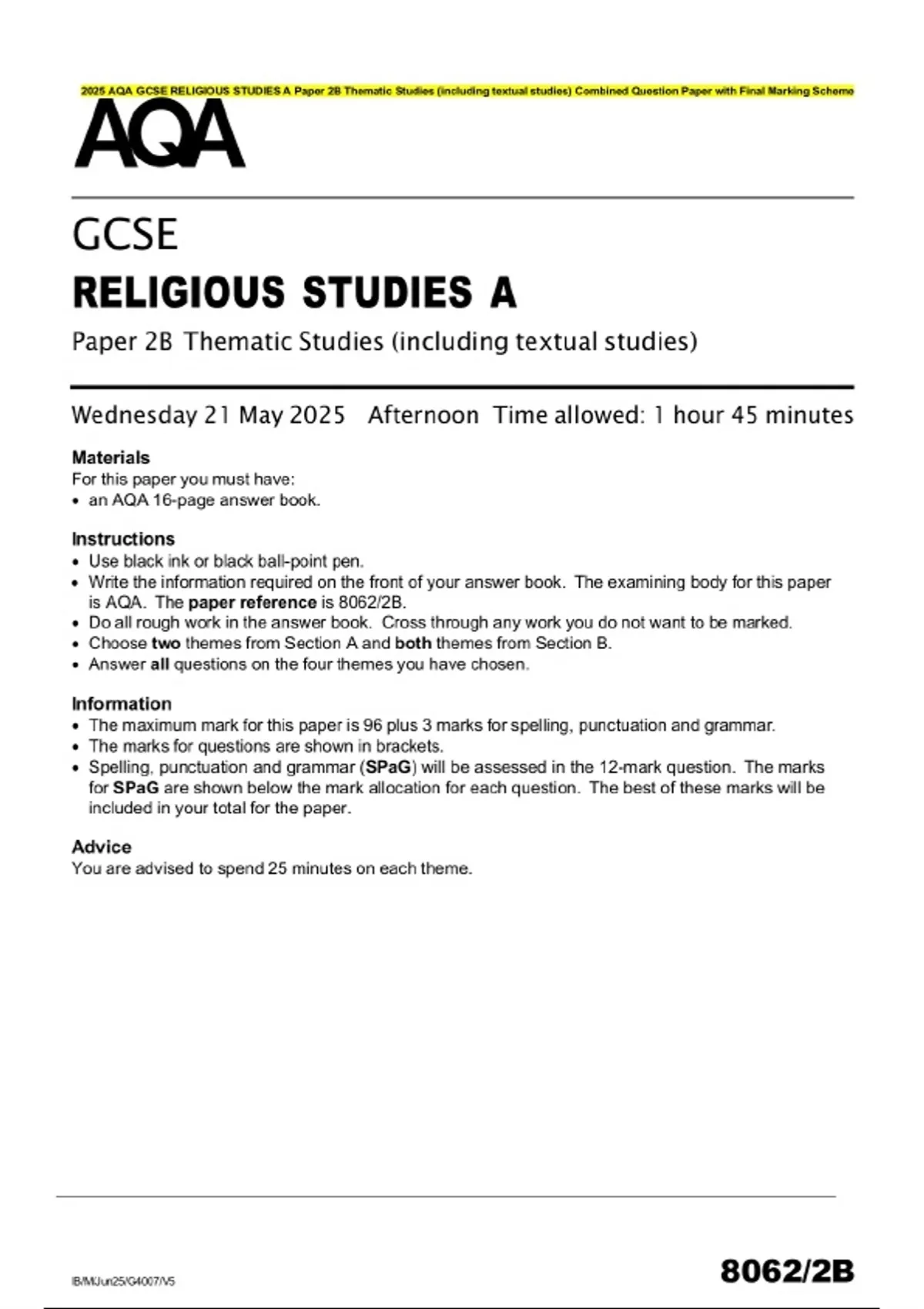2025 AQA GCSE RELIGIOUS STUDIES A Paper 2B Thematic Studies (including textual studies) Combined Question Paper with Final Marking Scheme