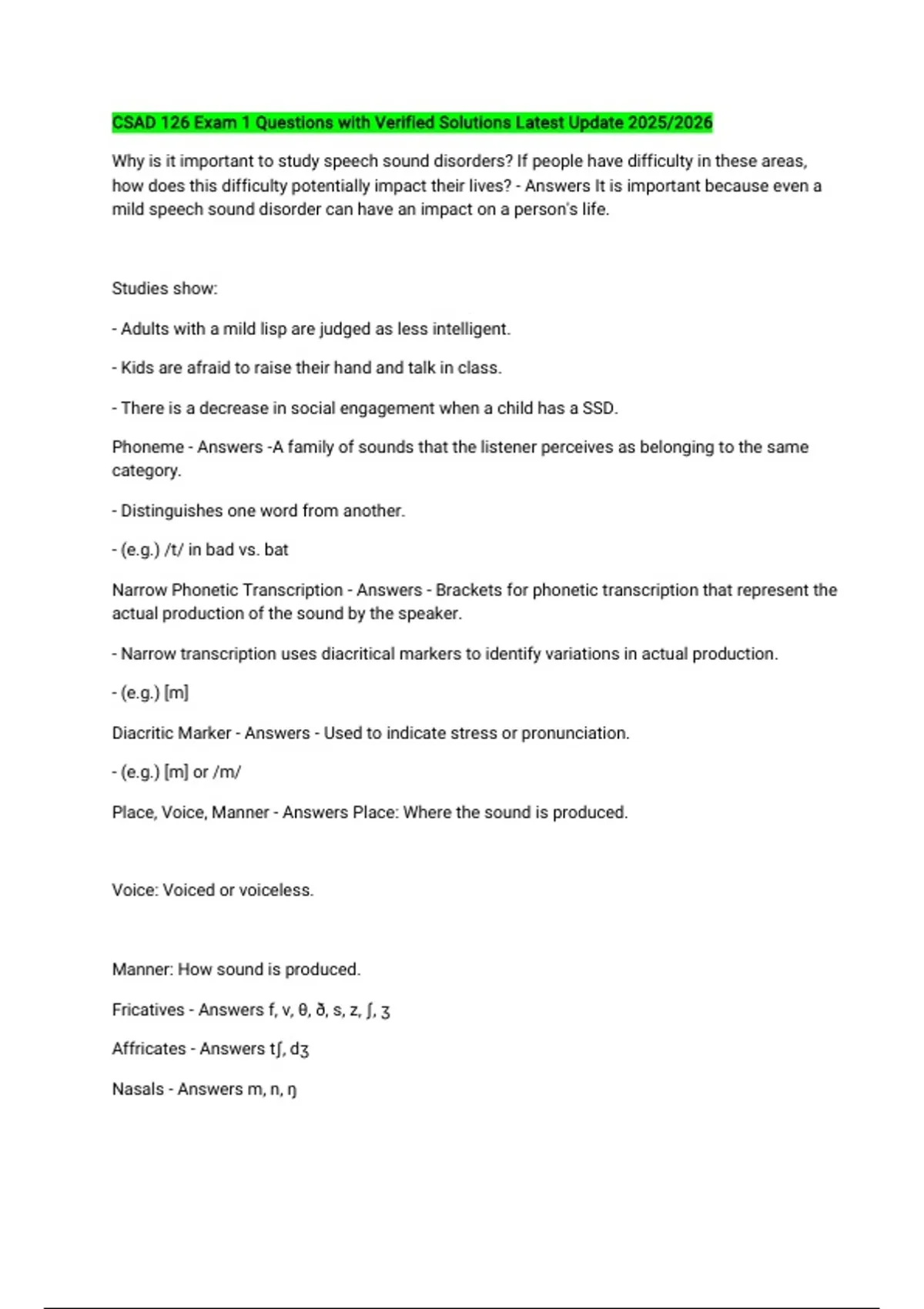 CSAD 126 Exam 1 Questions with Verified Solutions Latest Update 2025/2026 Why is it important to study speech sound disorders? If people have difficulty in these areas, how does this difficulty potentially impact their lives? - Answers It is important because even a mild speech sound disorder can have an impact on a person's life. Studies show: - Adults with a mild lisp are judged as less intelligent. - Kids are afraid to raise their hand and talk in class. - There is a decrease in social engagement when a child has a SSD. Phoneme - Answers -A family of sounds that the listener perceives as belonging to the same category. - Distinguishes one word from another. - (e.g.) /t/ in bad vs. bat Narrow Phonetic Transcription - Answers - Brackets for phonetic transcription that represent the actual production of the sound by the speaker. - Narrow transcription uses diacritical markers to identify variations in actual production. - (e.g.) [m] Diacritic Marker - Answers - Used to indicate stress or pronunciation. - (e.g.) [m] or /m/ Place, Voice, Manner - Answers Place: Where the sound is produced. Voice: Voiced or voiceless. Manner: How sound is produced. Fricatives - Answers f, v, θ, ð, s, z, ʃ, ʒ Affricates - Answers tʃ, dʒ Nasals - Answers m, n, ŋ Glides - Answers w, j Liquids - Answers l, upside down r Sounds mastered by 4 years old - Answers /b, p, m, t, g, d, n, f, k, w, h, ŋ/ Sounds mastered by 5-7 years old - Answers /j, ʃ, tʃ, l, j, s, r, v, z, θ, ð/ Morphophonemics - Answers Sound alterations that result from the modification of free morphemes (whole word that cannot be broken down into smaller units). Morphophonemic rules - Answers 1. If a noun ends in a voiced sound, use /z/. (Bags, tails) 2. If a noun ends in a voiceless sound, use /s/. (Cops, lakes) Phonological pattern/process - Answers Simplifications of adult sound productions that affect entire classes of sounds. Phonological awareness - Answers A child's underlying awareness that words are created by sound (phonemes) & combination of sounds. If a child says "tat" instead of "cat", what process is that? - Answers Velar Fronting Unstressed/Weak Syllable Deletion - Answers When a consonant cluster is reduced to a single consonant. Banana to nana Tomato to nado Elephant to efant Reduplication - Answers Repetition of a syllable. Partial: Bottle to babi Complete: Bottle to baba Water to wawa Epenthesis - Answers Insertion of a schwa between 2 consonants. Spaghetti to su-paghetti Blue to bu-lue Diminutization - Answers Adding /i/ to the end of the word. Mom to mommy Dad to daddy Dog to doggy