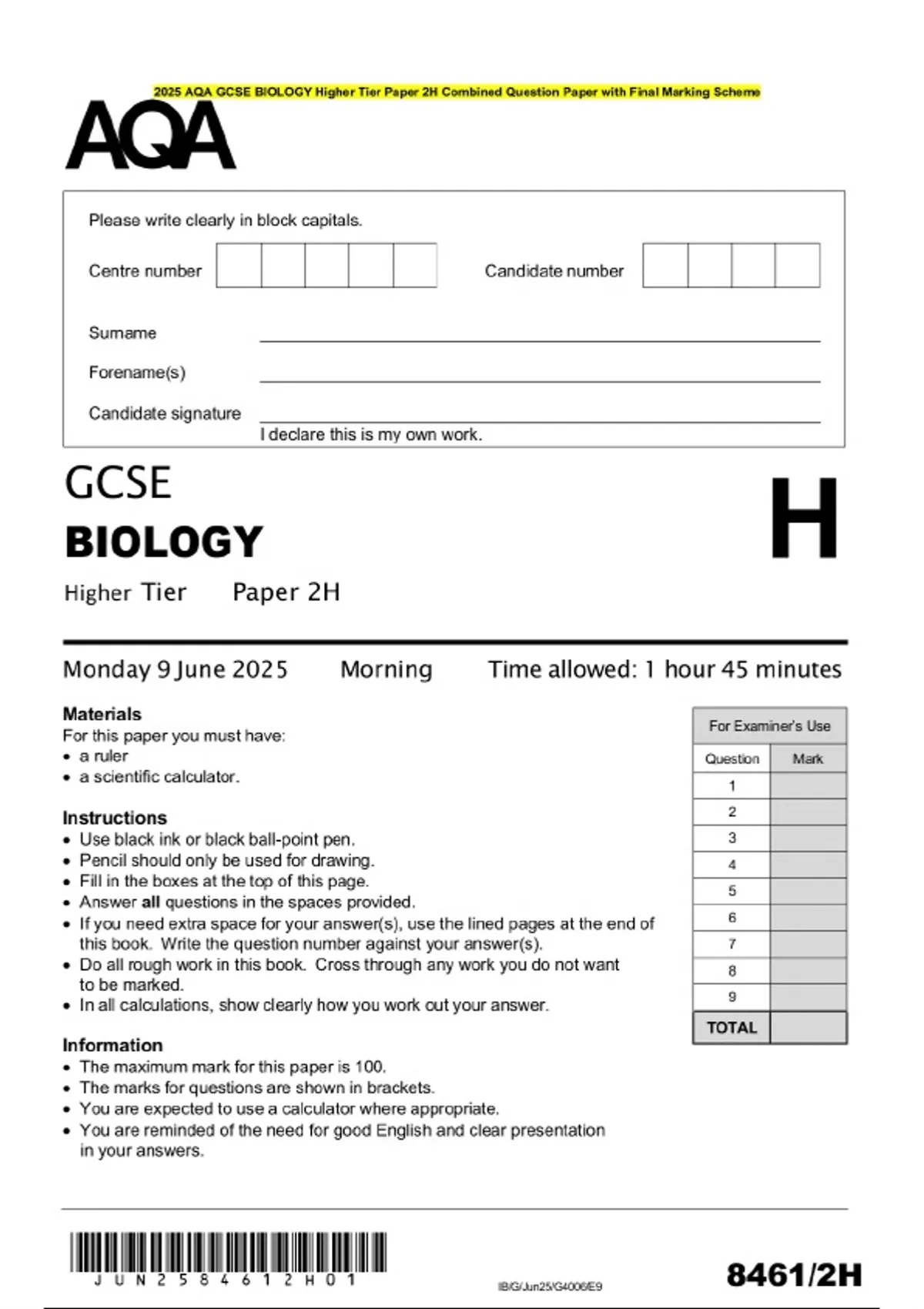 2025 aqa gcse biology higher tier paper 2h combine