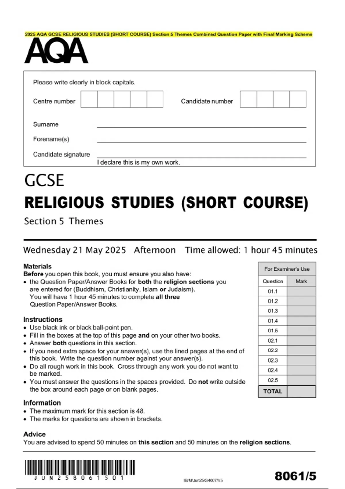 2025 AQA GCSE RELIGIOUS STUDIES (SHORT COURSE) Section 5 Themes Combined Question Paper with Final Marking Scheme