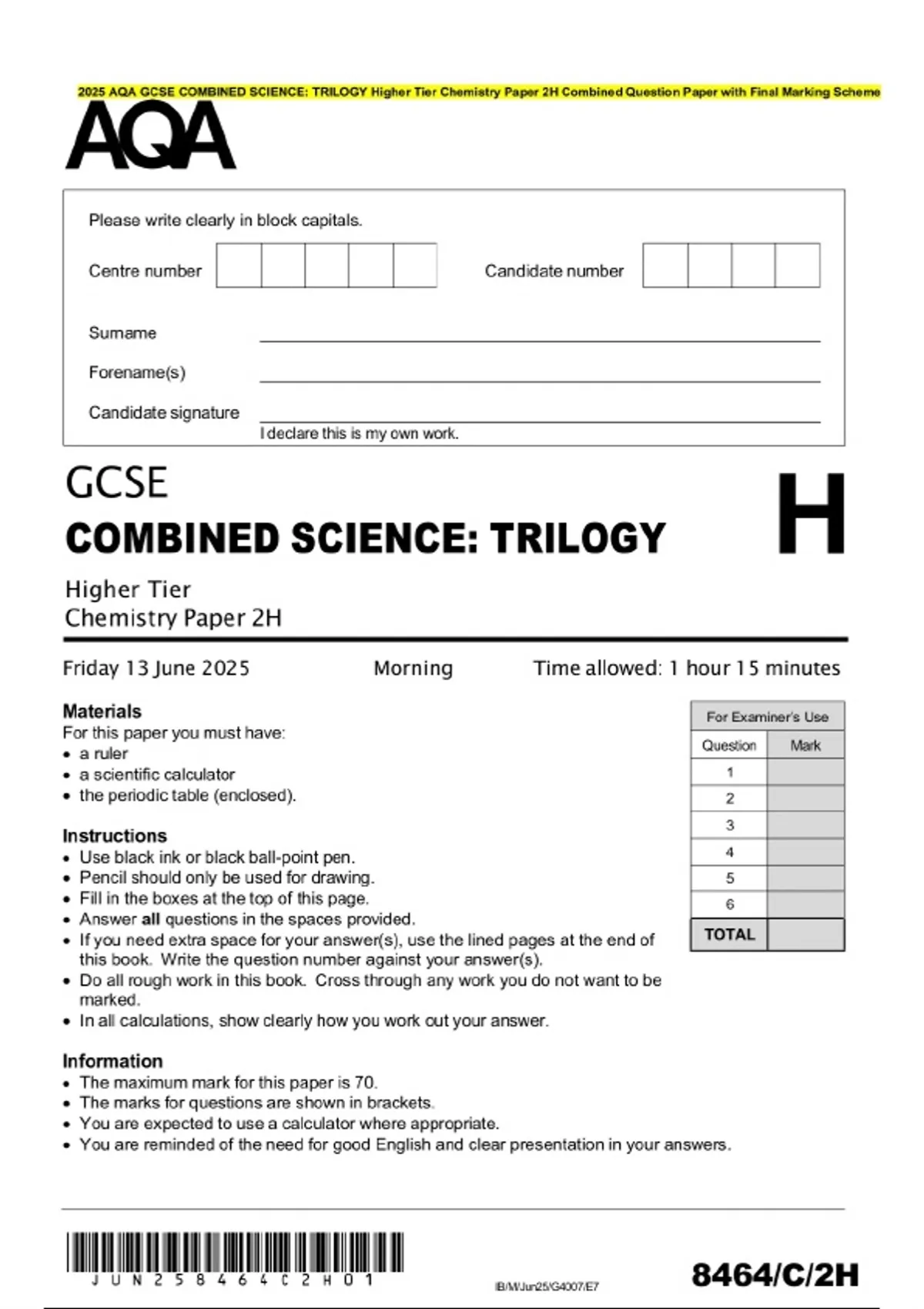 2025 AQA GCSE COMBINED SCIENCE: TRILOGY Higher Tier Chemistry Paper 2H Combined Question Paper with Final Marking Scheme