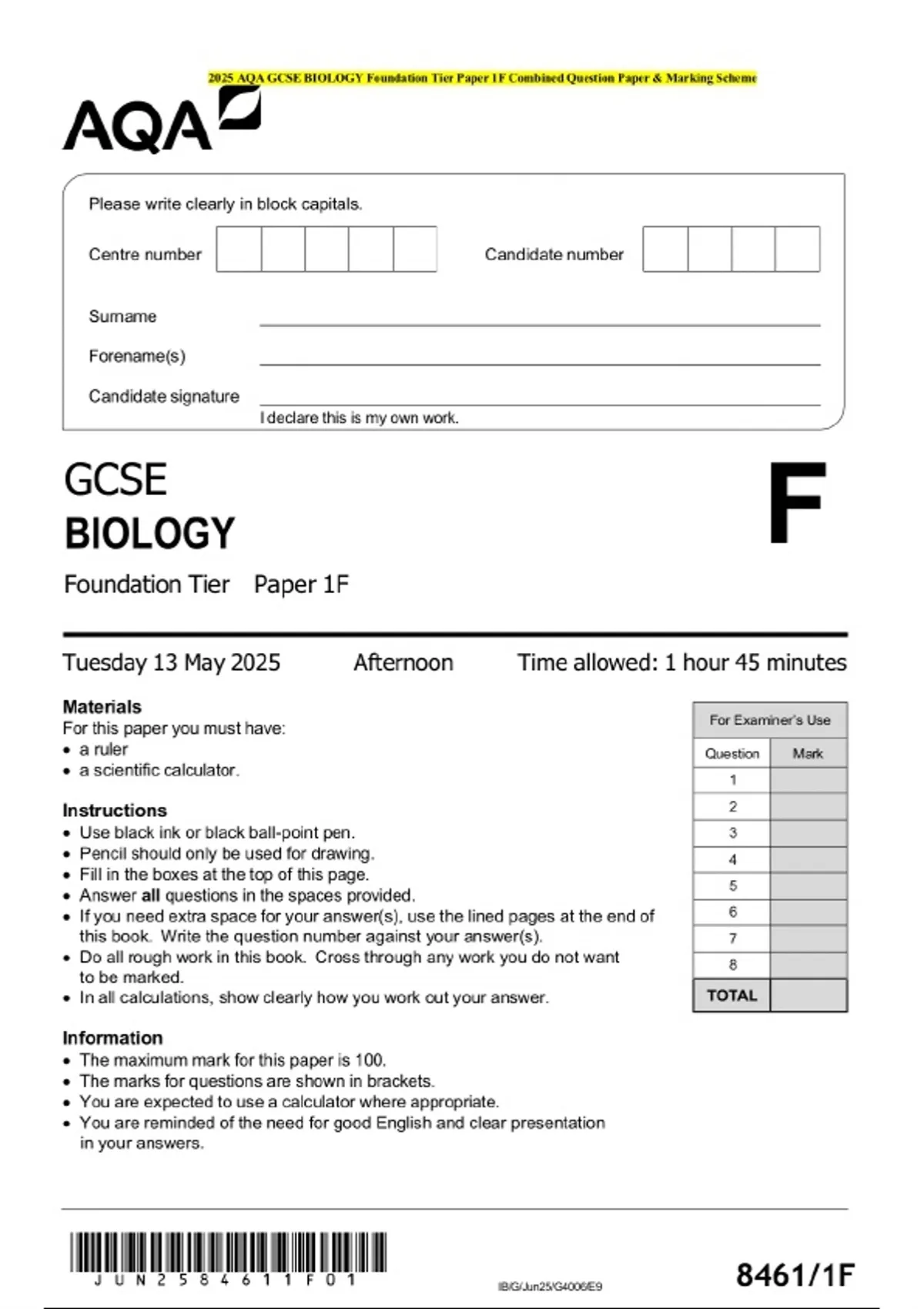 2025 AQA GCSE BIOLOGY Foundation Tier Paper 1F Combined Question Paper & Marking Scheme