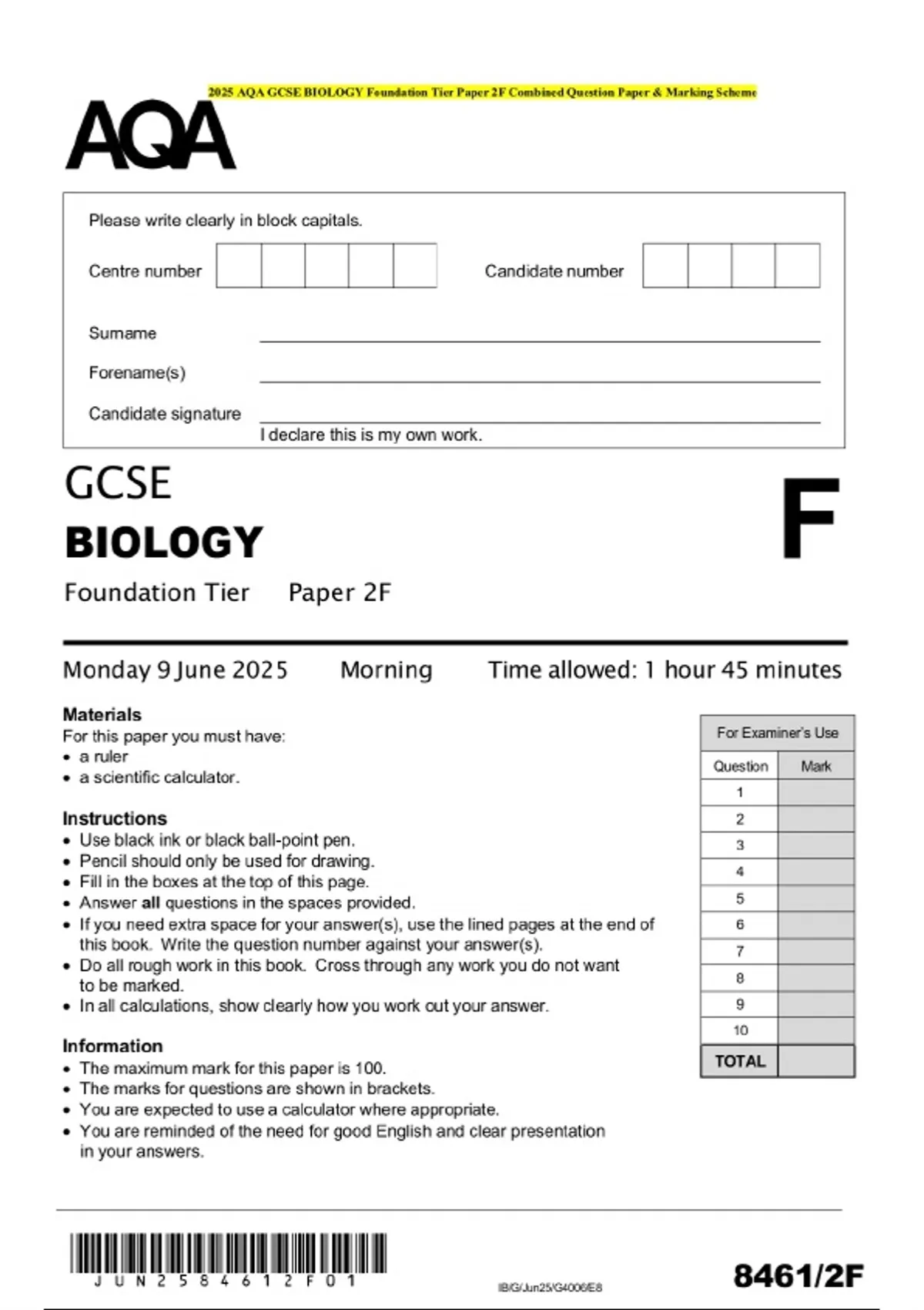 2025 AQA GCSE BIOLOGY Foundation Tier Paper 2F Combined Question Paper & Marking Scheme
